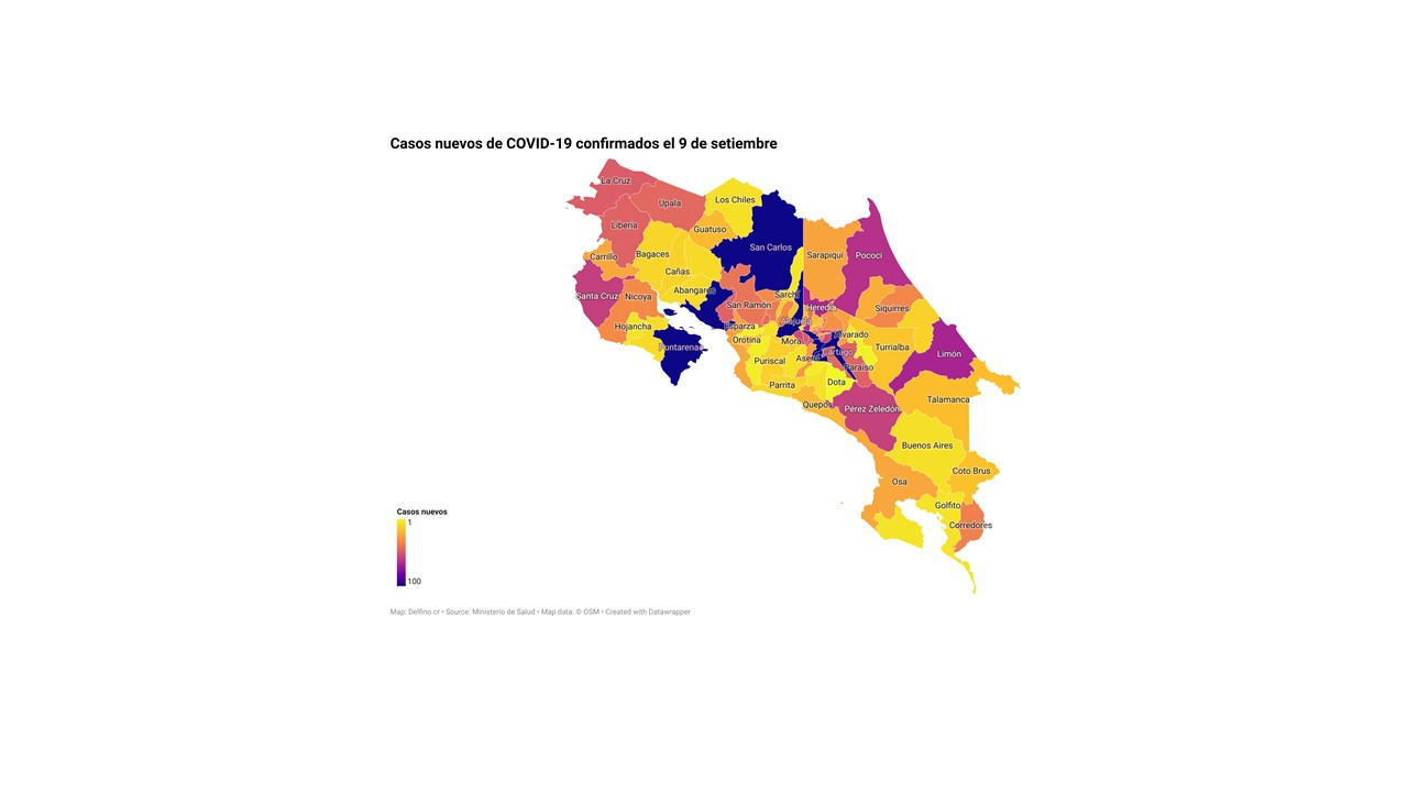 El Ministerio de Salud de Costa Rica informó la tarde de hoy que los 2975 casos nuevos de COVID-19 registrados se ubican en los 82 cantones del país.
