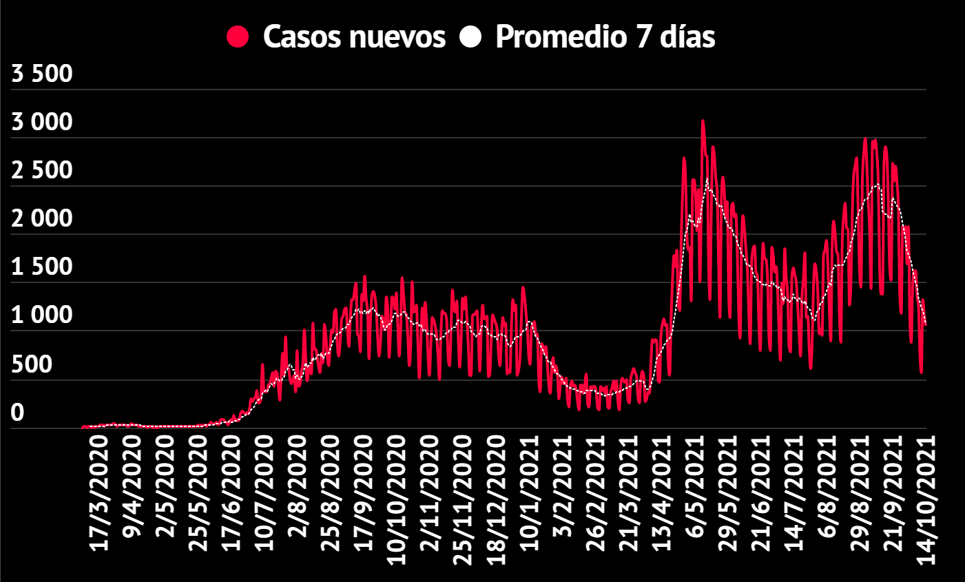 Datos clave del día: La incidencia promediada a siete días cayó 11 puntos hasta los 144 casos nuevos por cada 100 mil habitantes; la cifra diaria de casos nuevos promediada a siete días bajó a 1069.