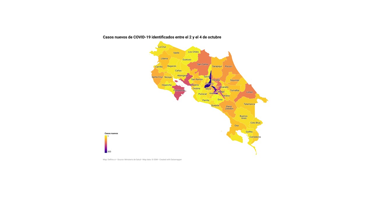 El Ministerio de Salud de Costa Rica informó la tarde de hoy que los 4043 casos nuevos de COVID-19 registrados entre el 2 y 4 de octubre se ubican los 82 cantones del país.