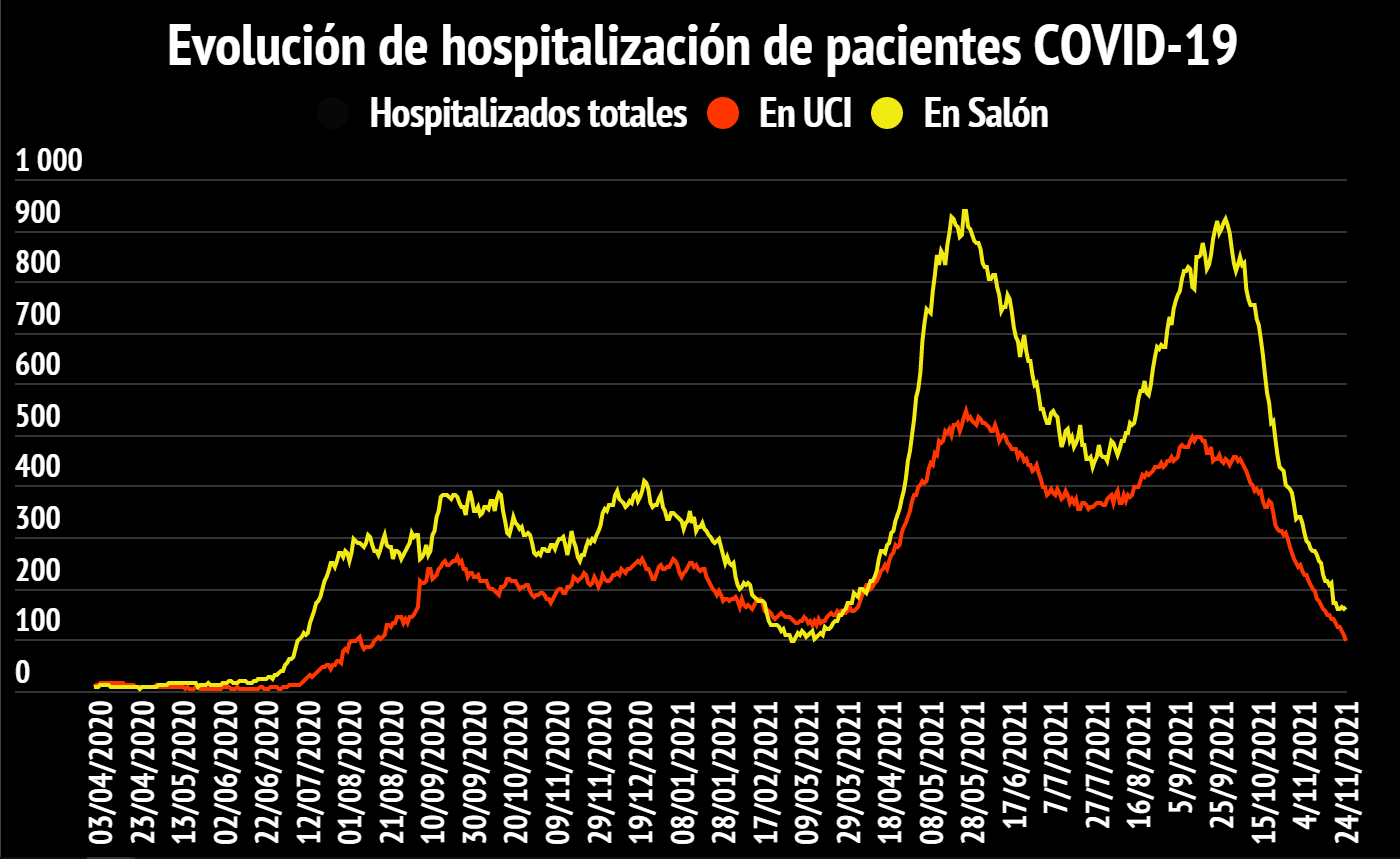 Hay 262 personas hospitalizadas (-8) de las cuales 98 están internadas en Unidades de Cuidados Intensivos (-12) con edades de entre 21 a 98 años.