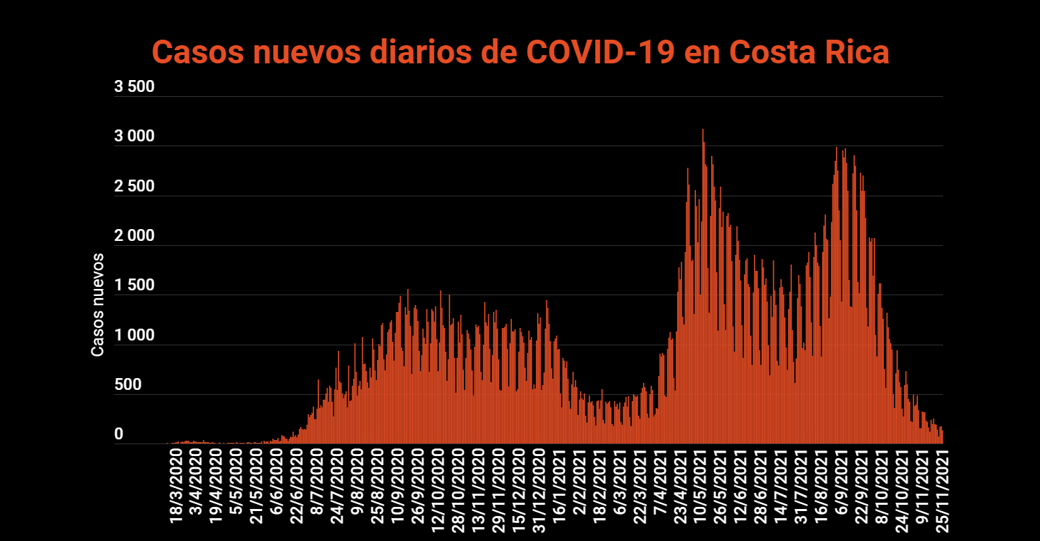 El Ministerio de Salud de Costa Rica confirmó este 25 de noviembre 133 nuevos casos de COVID-19 en el país, con lo cual la cifra total de casos se eleva a 566.429. Respecto al día de ayer, la variación de los casos confirmados fue del 0.02%.