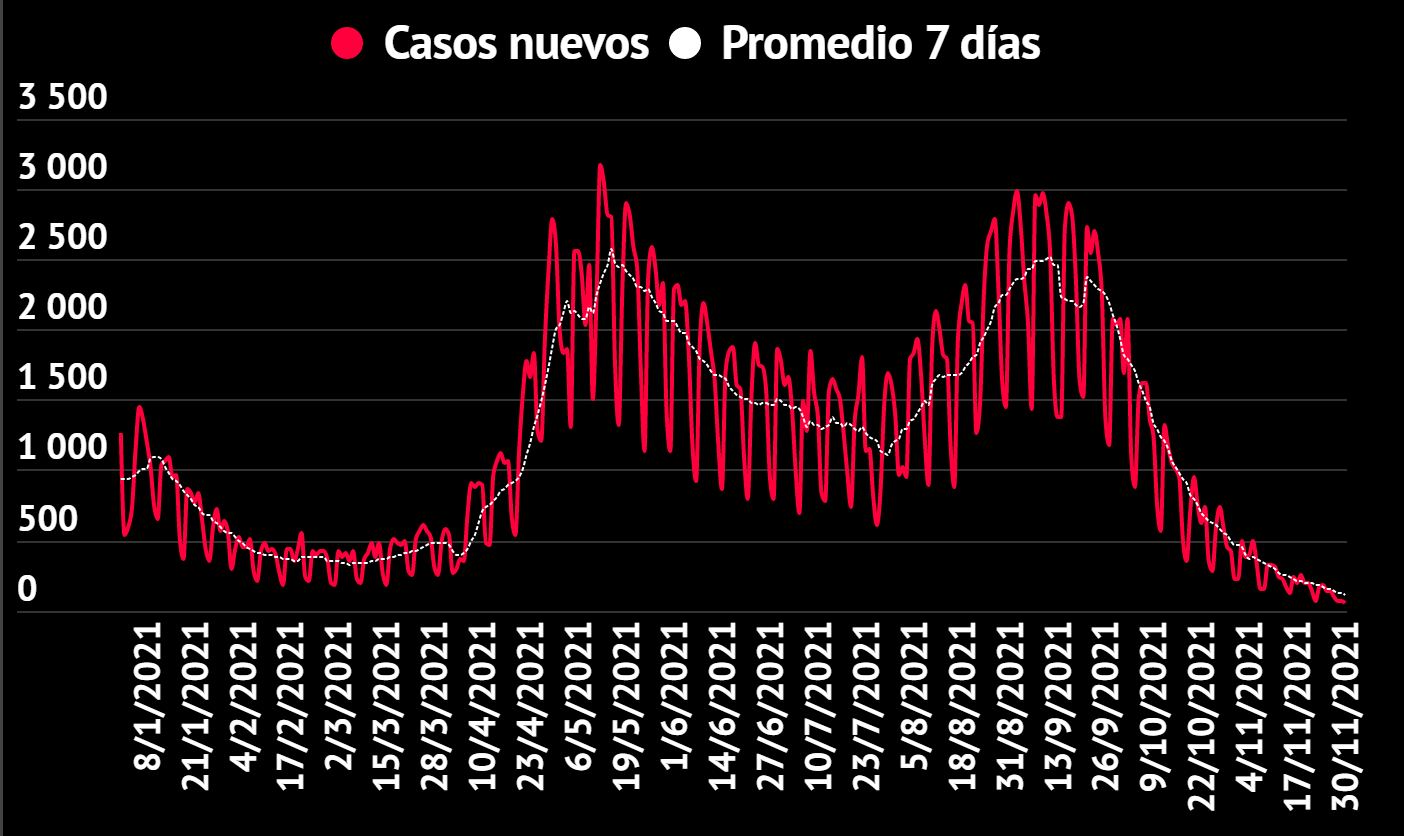 El sábado 27 de noviembre se reportaron 100 casos nuevos (86 por prueba y 14 por nexo), el domingo 28 de noviembre se reportaron 70 casos nuevos (59 por prueba y 11 por nexo), el lunes 29 de noviembre se reportaron 61 casos nuevos (61 por prueba y 0 por nexo) y este martes 30 de noviembre se registran 48 casos nuevos (45 por prueba y 3 por nexo).