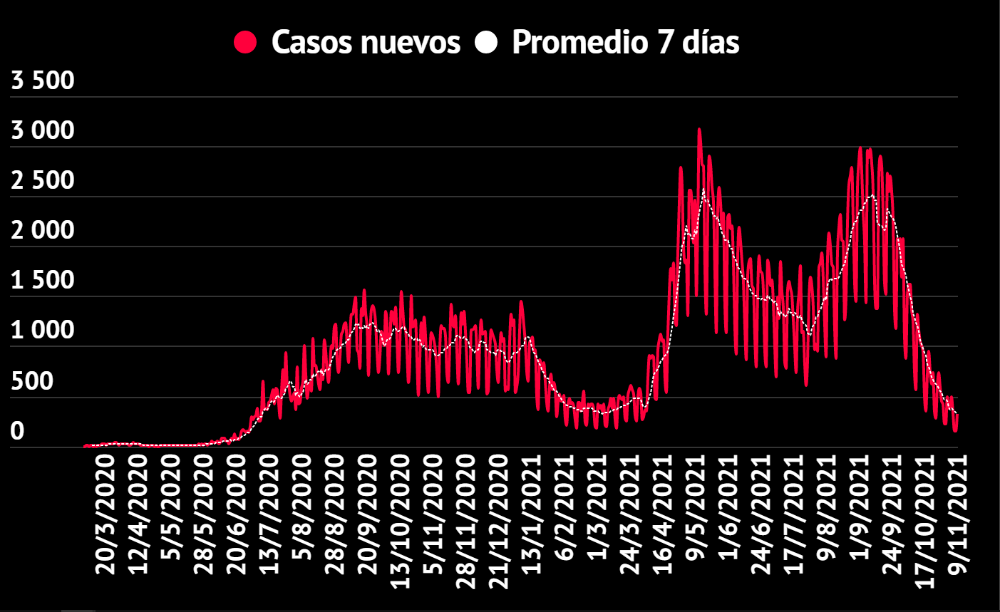 Datos clave del día: La incidencia semanal bajó tres puntos hasta los 43 casos nuevos por cada 100 mil habitantes. La cifra diaria de casos nuevos promediada a siete días bajó a 319.
