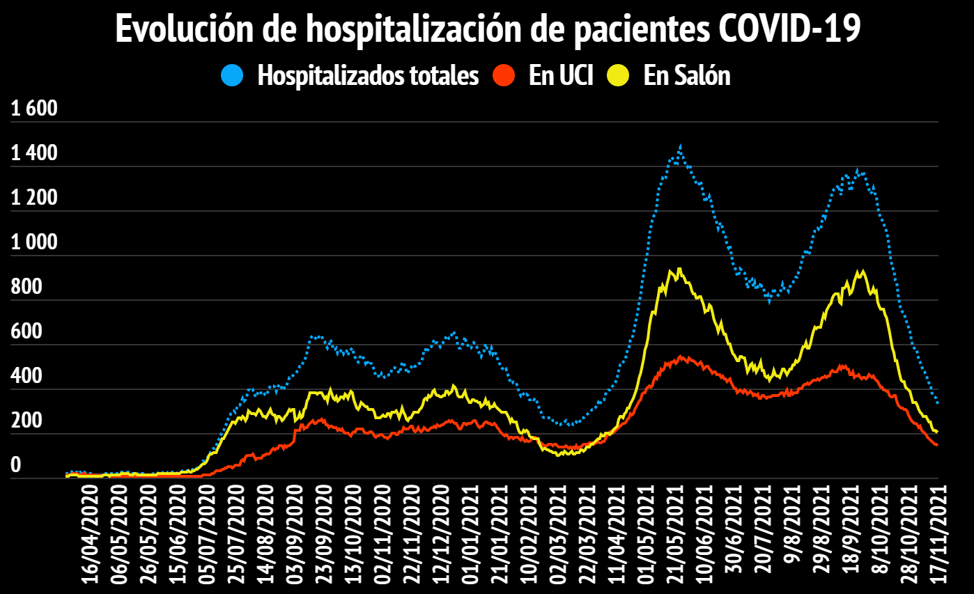 Hay 331 personas hospitalizadas (-23) de las cuales 141 están internadas en Unidades de Cuidados Intensivos (-7) con edades de entre 0 a 98 años.