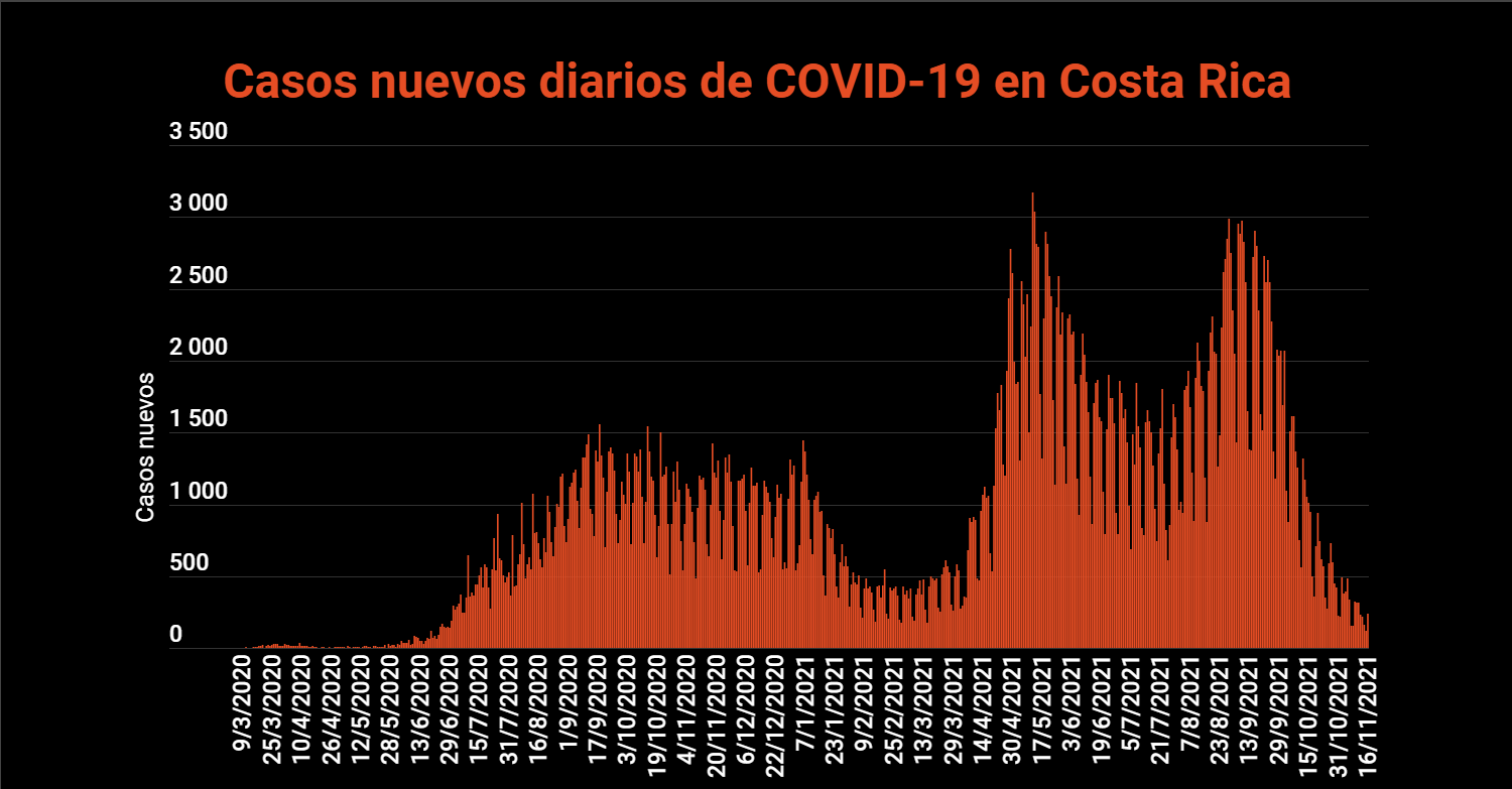 El Ministerio de Salud de Costa Rica confirmó este 16 de noviembre 239 nuevos casos de COVID-19 en el país, con lo cual la cifra total de casos se eleva a 564.901. Respecto al día de ayer, la variación de los casos confirmados fue del 0.04%.