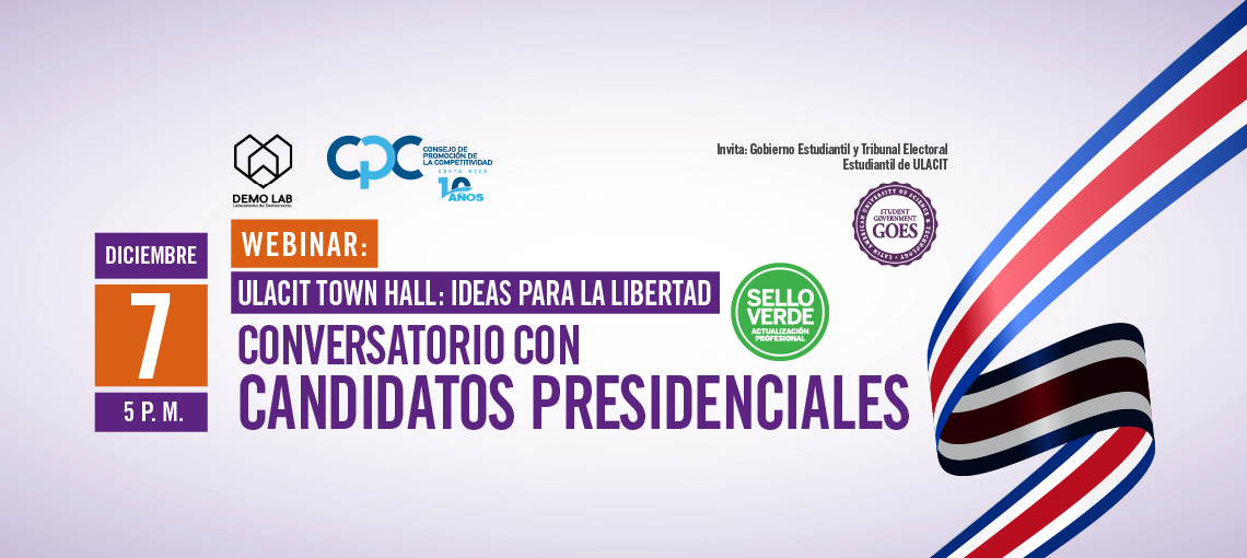 El conversatorio, que lleva por nombre "ULACIT Town Hall : Ideas para la Libertad", se realizará con una metodología completamente virtual. Para inscribirse de manera gratuita solo es necesario ingresar a https://www.eventbrite.com/e/210037005337/. Los siete candidatos presidenciales que participarán son: