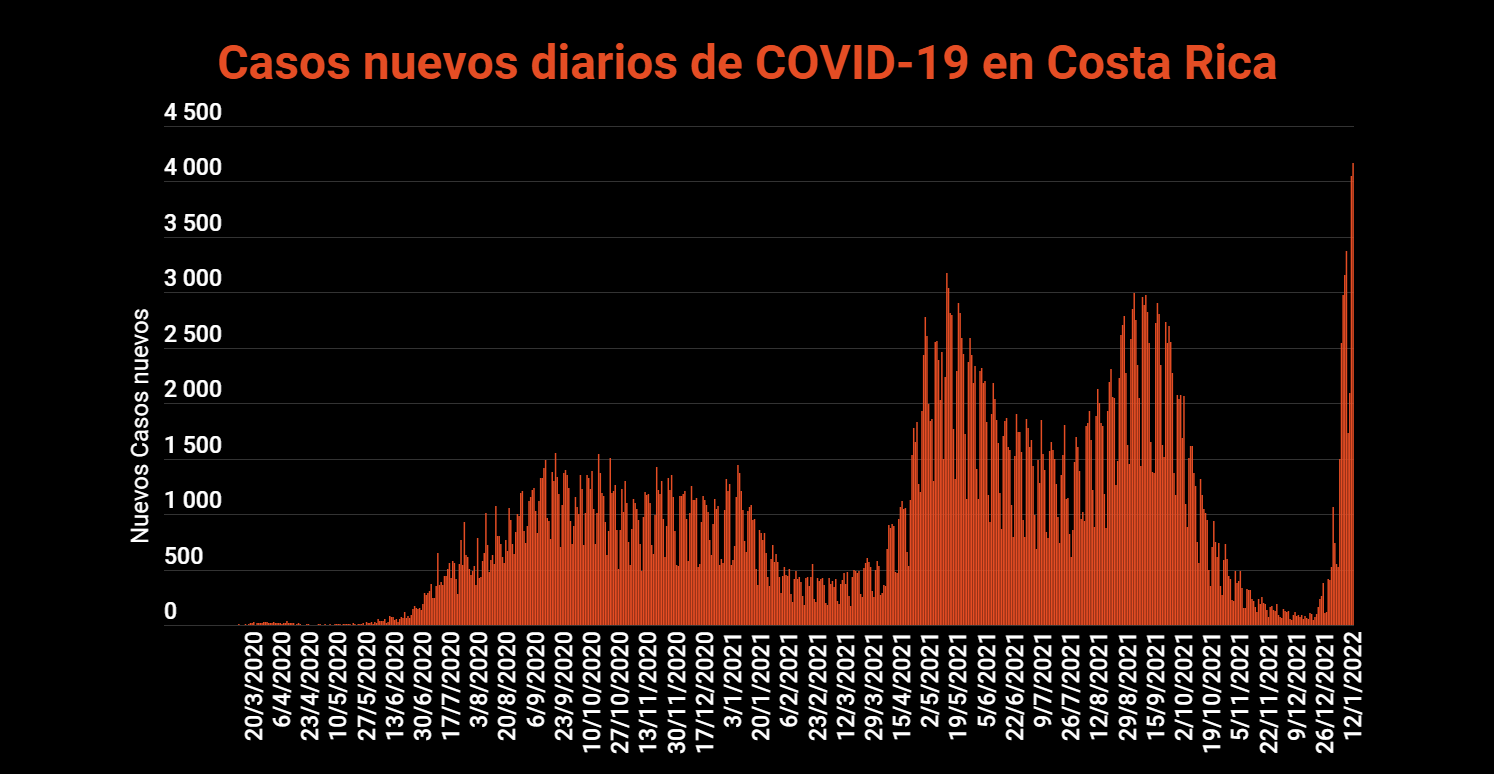 El Ministerio de Salud de Costa Rica confirmó este 12 de enero 4494 nuevos casos de COVID-19 en el país, con lo cual la cifra total de casos se eleva a 600.842. Respecto al día de ayer, la variación de los casos confirmados fue del 0.69%.