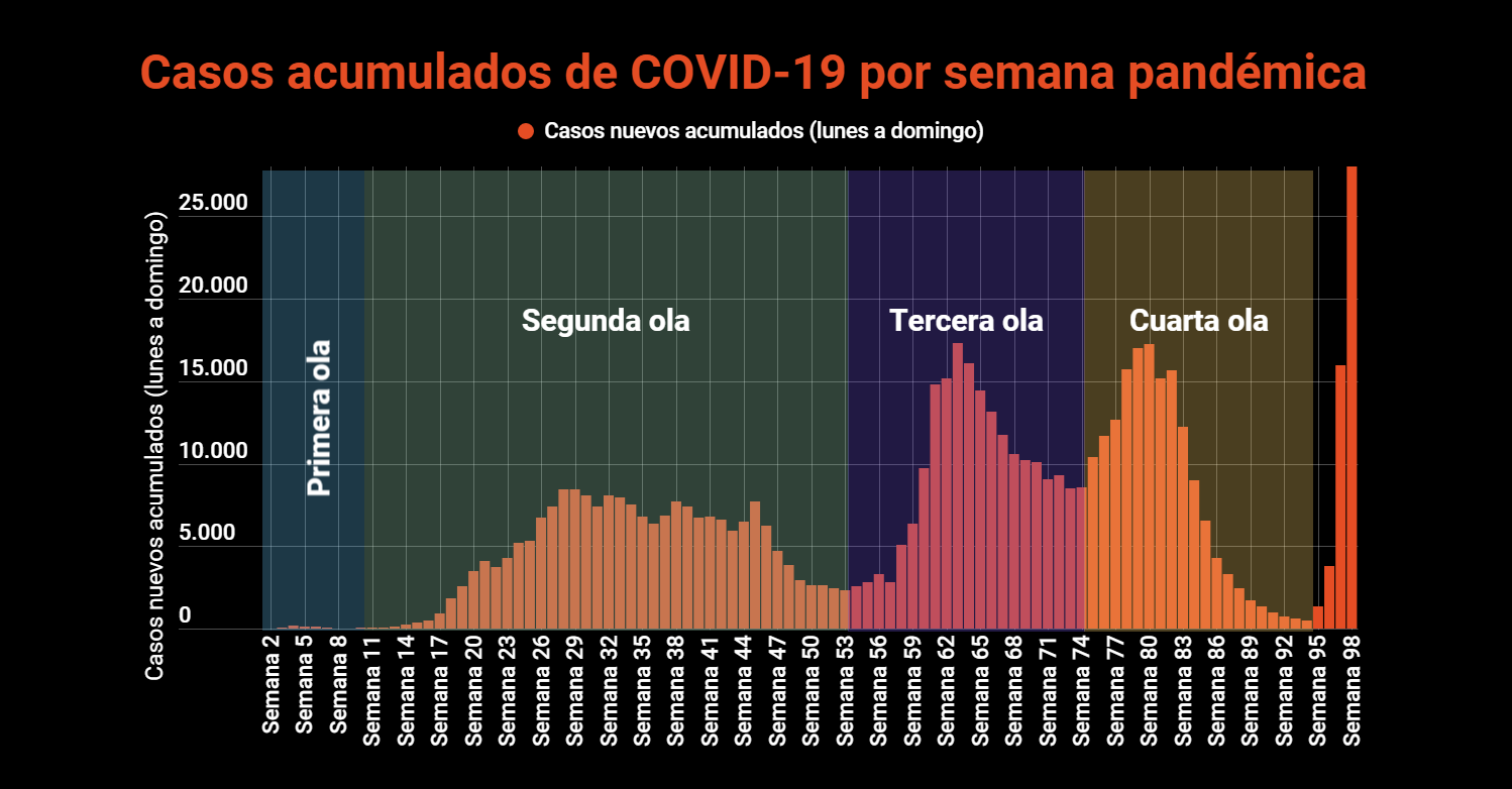 Datos clave del día: La incidencia semanal marca un nuevo récord al crecer desde el viernes 63 puntos, hasta los 553 casos nuevos por cada 100 mil habitantes; y la cifra diaria de casos promediada a siete días subió a 4086. La semana pandémica 98 que terminó el domingo cerró con 27.974 casos acumulados de COVID-19, una cifra récord en la pandemia y que representa un crecimiento del 75.4% respecto a los 15.945 casos registrados la semana antes. Los fallecimientos también crecieron 70% de una semana a la otra, al pasar los decesos de 20 a 34.