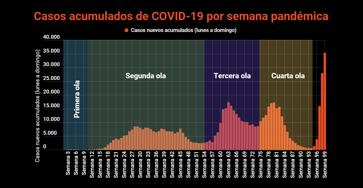 Datos clave del día: La incidencia semanal subió 31 puntos desde el sábado hasta los 682 casos nuevos por cada 100 mil habitantes y la cifra diaria de casos nuevos promediada a siete días subió a 5034. La semana pandémica 99 registró un nuevo récord con 35.367 casos de COVID-19, un incremento del 26.4% respecto a la semana 98; los decesos crecieron 61.7% al pasar de 34 a 55 y los ingresos hospitalarios por COVID-19 crecieron 54.4% al pasar de 318 a 491.