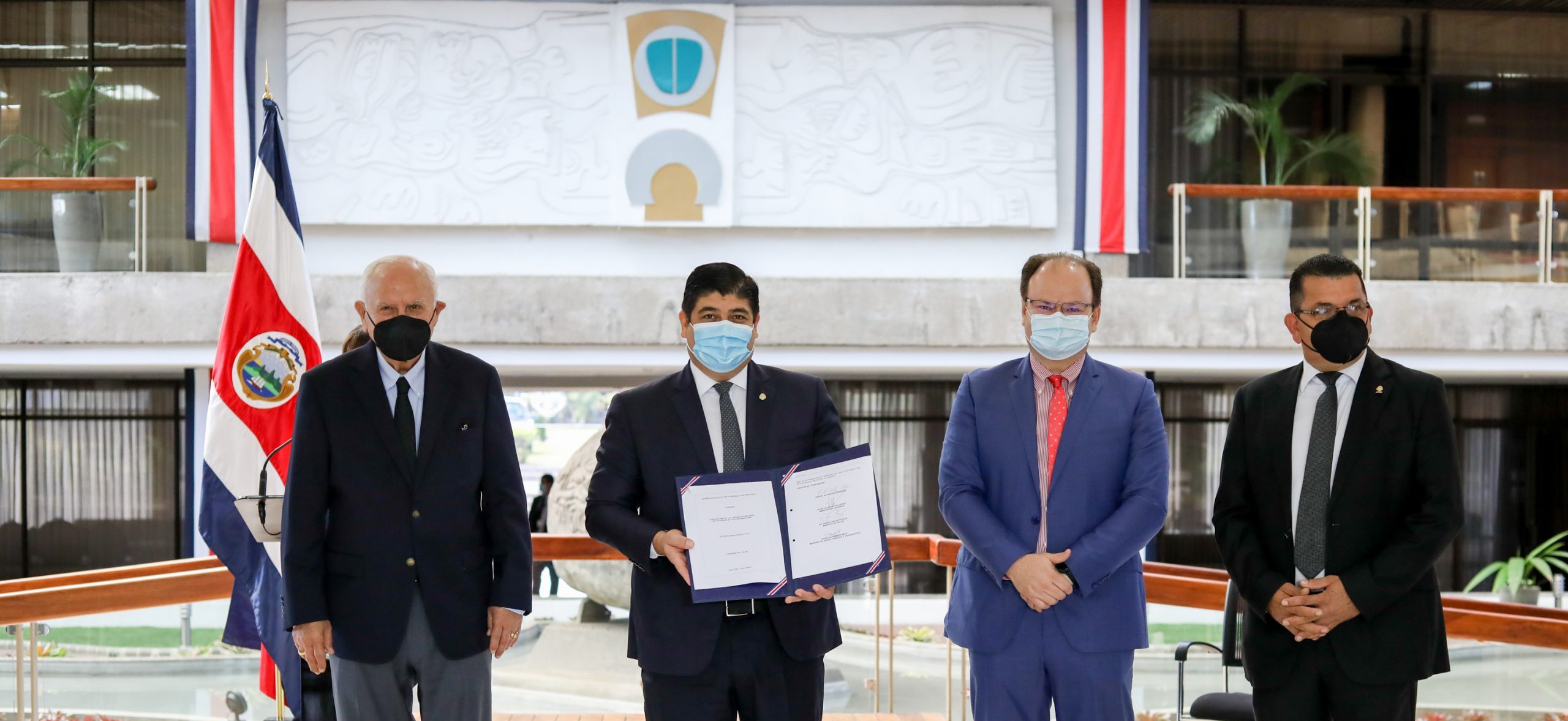 El presidente de la República, Carlos Alvarado Quesada, y sus ministros de Hacienda, Elian Villegas Valverde y de Obras Públicas y Transporte, Rodolfo Méndez Mata; y previamente el ministro de Salud, Daniel Salas Peraza, firmaron hoy la Ley “Condonación de las deudas acumuladas relacionadas al pago del marchamo” (10.119), en un acto realizado en Casa Presidencial, donde también asistió el diputado del PAC Luis Ramón Carranza, proponente principal de la iniciativa.