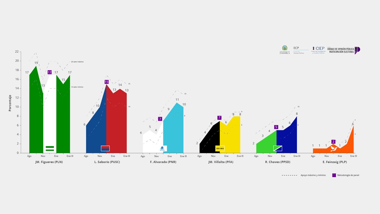 Detrás de ellos y por encima del margen de error aparecen Rodrigo Chaves Robles de Progreso Social Democrático con 8.2%, seguido de José María Villalta Flórez-Estrada del Frente Amplio con 7.6% y Eliecer Feinzaig Mintz del Liberal Progresista con un 5.7%. Las otras 19 candidaturas no superan el margen de error y en conjunto suman apenas un 4.7% de apoyo.