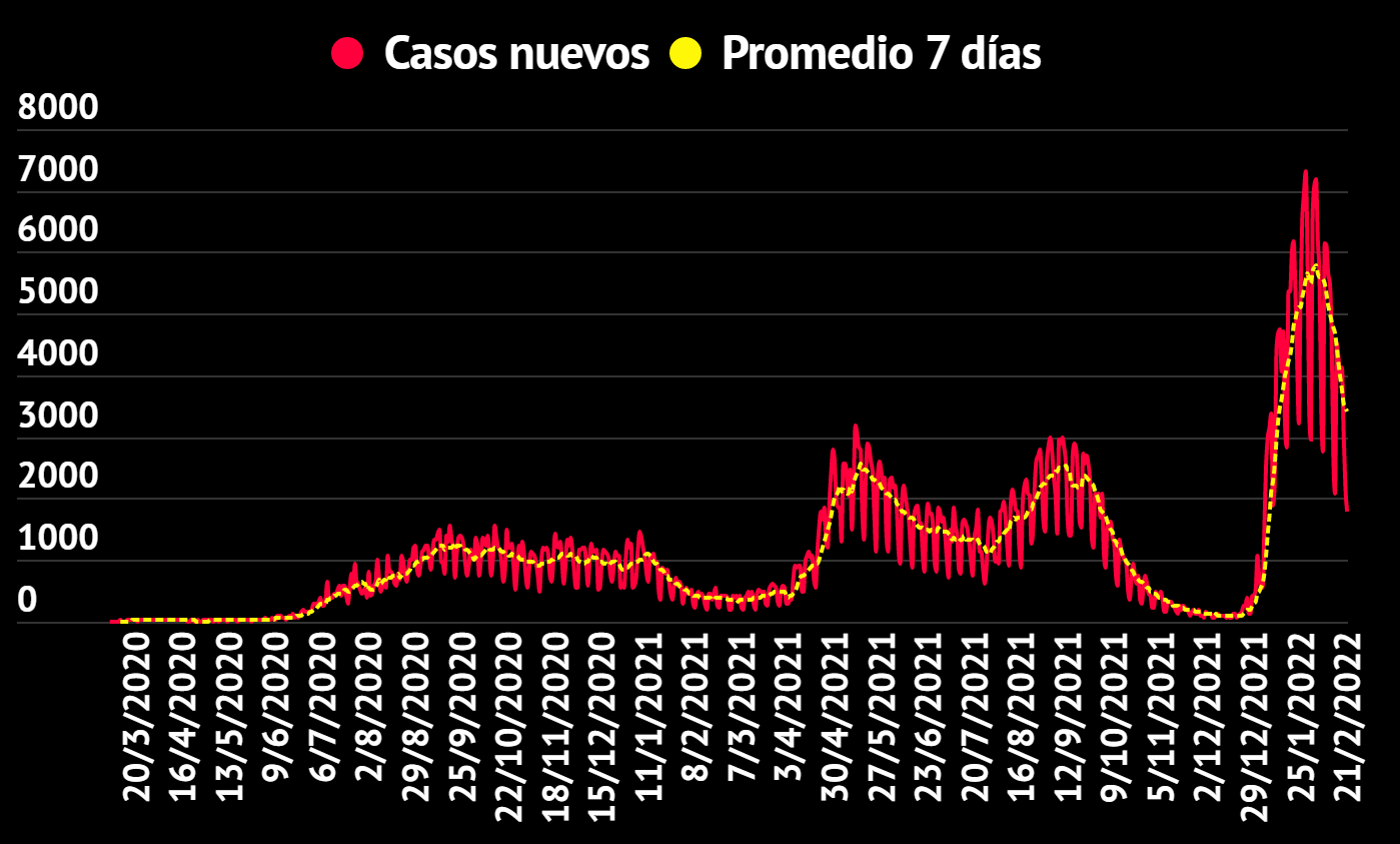 El sábado 19 de febrero se reportaron 3053 casos nuevos, el domingo 20 de febrero se reportaron 2179 casos nuevos y el día de hoy, 21 de febrero, se reportaron 1775 casos nuevos.