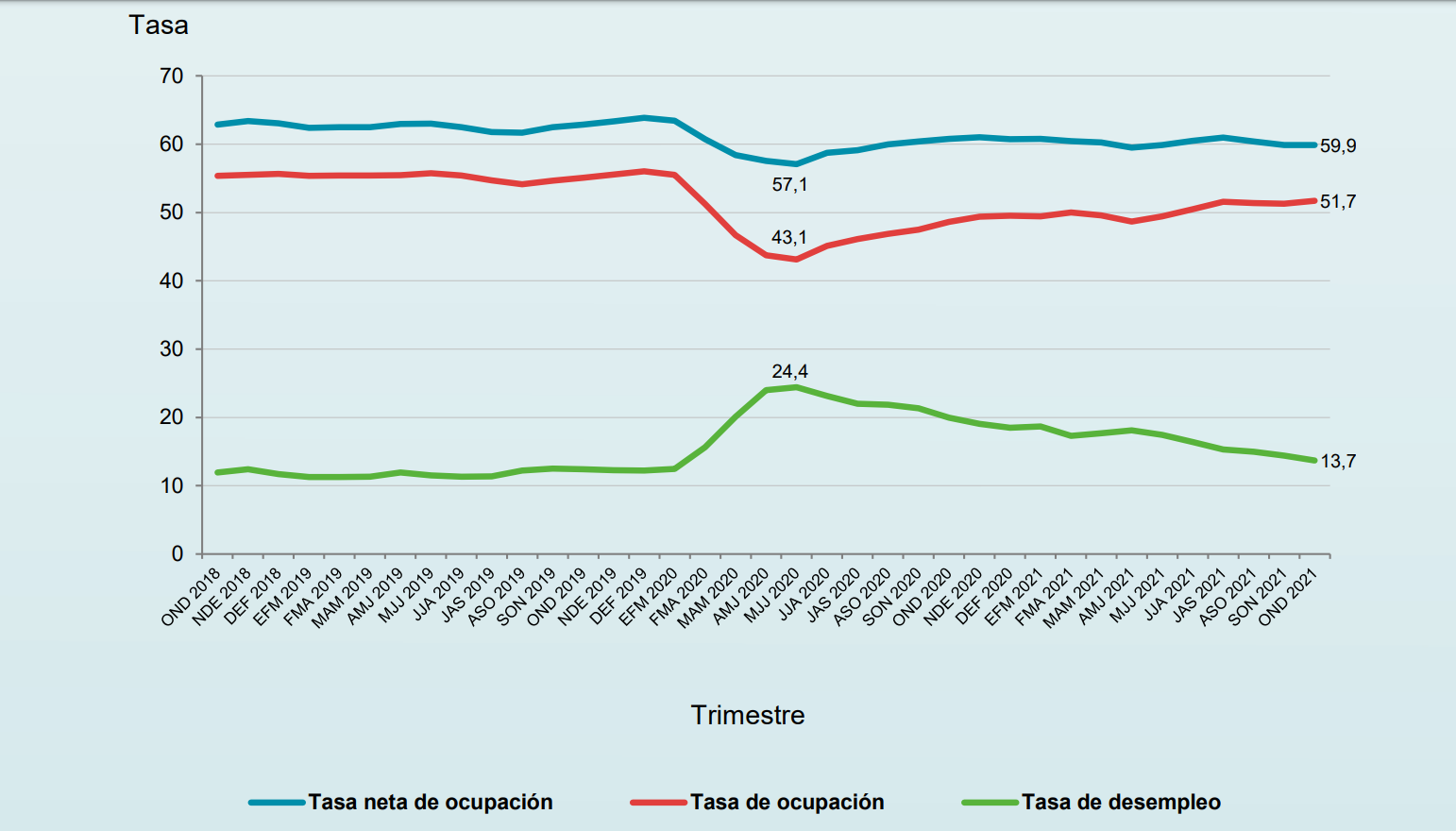 Tras el estallido de la pandemia, el INEC actualiza las cifras de desempleo mediante trimestres móviles: incorpora los datos de un mes nuevo y excluye los del último. Ello permitió ver, en 2020, que la crisis sanitaria llevó el desempleo hasta un máximo de 24.4% para el trimestre de mayo a julio de 2020 y ha ido a la baja desde entonces, con algunos retrocesos en marzo, mayo y junio de 2021, pero volviendo a bajar sostenidamente desde julio de ese año.