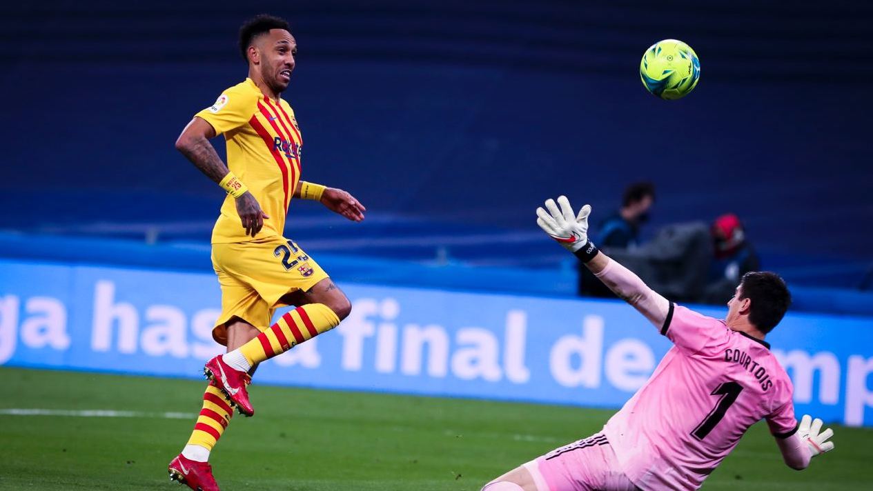 En medio de las reclamaciones de que el guardameta había derribado al brasileño, Dembélé volvió a complicar a Nacho para conectar de nuevo con Aubameyang y con Courtois negándole otra vez el gol. Sin embargo, la jugada acabó en saque de esquina y Araujo se elevó por encima de todos para empezar a teñir de color culé el Clásico.