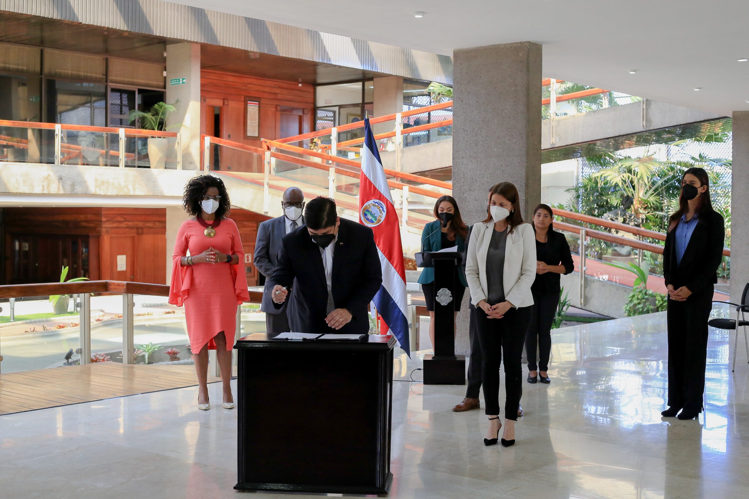 El presidente de la República, Carlos Alvarado Quesada, junto a la ministra de Justicia, Fiorella Salazar Rojas, firmó la mañana de este lunes la ley “Adición de un inciso 11) al Artículo 112 del Código Penal, Ley N°4573, de 4 de mayo de 1970”, que incrementa las penas de prisión entre 20 y 35 años para los homicidios motivados por odio que sucedan en el país.