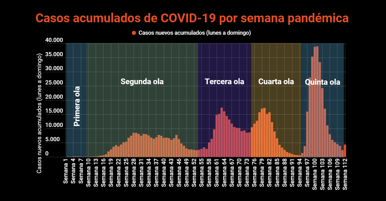 Datos clave del día: La semana pandémica 112 cerró con 4334 casos acumulados de COVID-19, una subida del 82.71% respecto a los 2372 casos registrados en la semana 111. Los decesos subieron 27.27%, al pasar de 22 a 28. Los nuevos ingresos hospitalarios por COVID-19 crecieron 90.82% al pasar de 109 a 208. La incidencia semanal subió 27 puntos respecto al martes de la semana pasada hasta los 83 casos nuevos por cada 100 mil habitantes y la cifra diaria de casos nuevos promediada a siete días subió a 613.