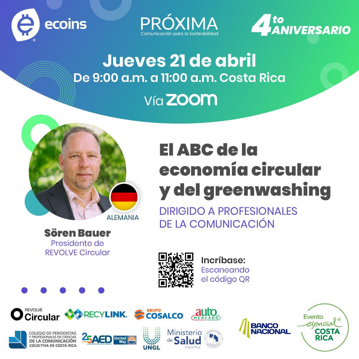 Para celebrar su cuarto aniversario Ecoins ha unido fuerzas con REVOLVE Circular (Austria) y juntos invitan a la charla, “El ABC de la economía circular y del greenwashing” a realizarse vía Zoom este jueves 21 de abril 2022 a las 9:00 a.m.