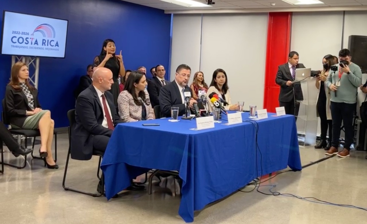 En la conferencia de prensa Chaves estuvo acompañado de Natalia Díaz Quintana, quien asumirá el Ministerio de la Presidencia y ha estado encargada de la conformación del gabinete para la próxima administración, así como de las dos vicepresidencias electas, Mary Munive Angermüller, quien coordinará el equipo del sector social del gobierno y Stephan Brunner Neibig, quien asumirá la coordinación del equipo económico.