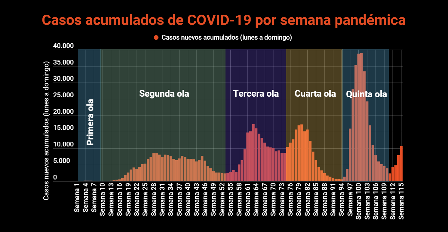 Datos clave del día: La semana pandémica 115 cerró con 10.726 casos acumulados de COVID-19, un aumento del 36.39% respecto a la semana 114. Los decesos pasaron de 26 a 24, una caída del 7.69%. Los ingresos hospitalarios pasaron de 170 a 251, para un incremento del 47.65%. La incidencia semanal se disparó 49 puntos hasta los 220 casos nuevos por cada 100 mil habitantes; mientras que la cifra diaria de casos nuevos, promediada a siete días, subió a 1624.