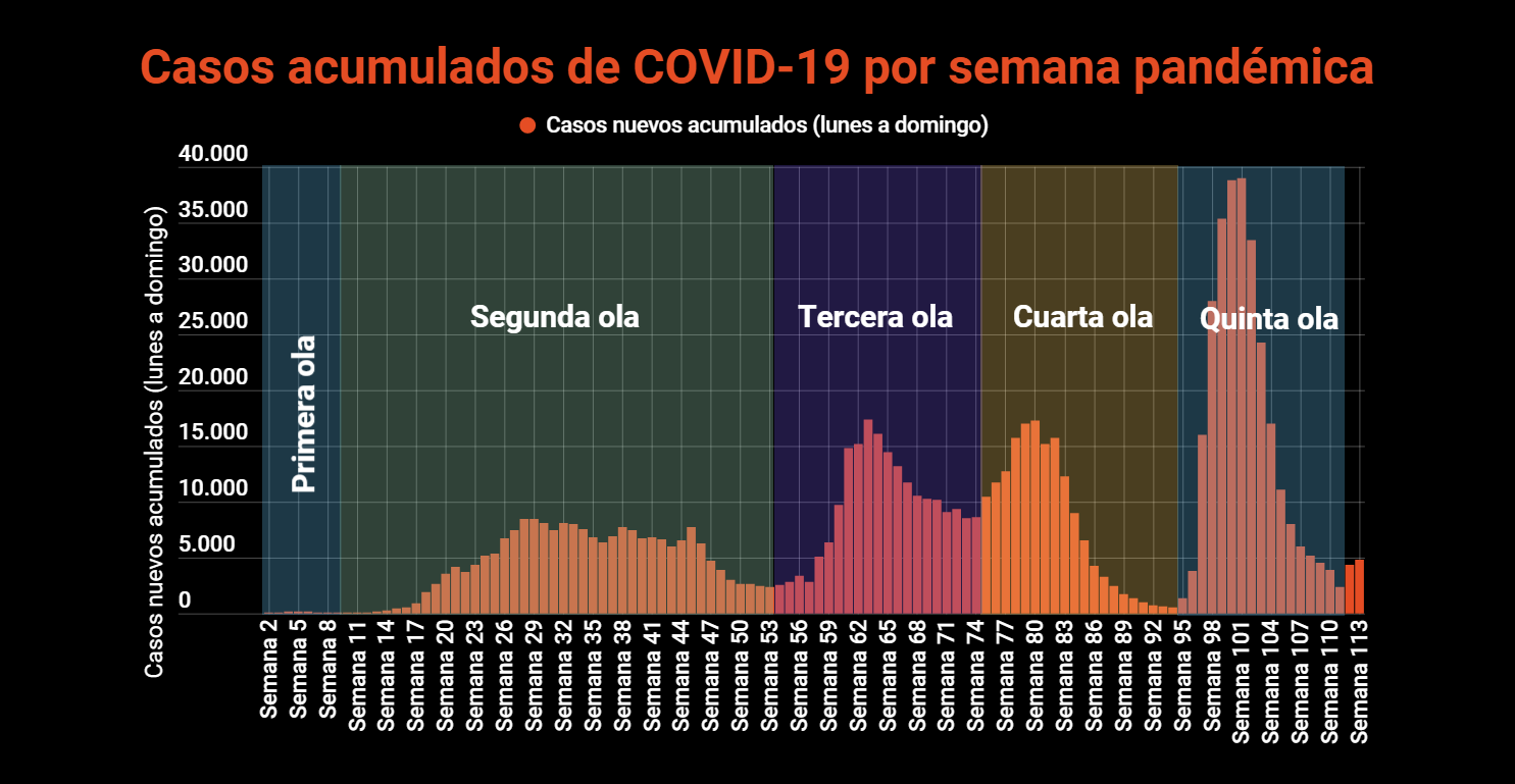 Datos clave del día: La semana pandémica 113 cerró con 4808 casos nuevos acumulados de COVID-19, un incremento del 10.93% respecto a la semana previa; los decesos bajaron 57.14% pasando de 28 a 12. La incidencia semanal subió 16 puntos respecto al martes de la semana pasada, hasta los 101 casos nuevos por cada 100 mil habitantes; y la cifra diaria de casos nuevos promediada a siete días subió a 745.