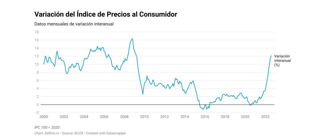 — Además, la inflación acumulada para los primeros 8 meses del año ya roza el doble dígito pues alcanzó el 9.45%, superando ampliamente el límite superior de la meta inflacionaria del Banco Central de Costa Rica, definido en ±3% (es decir entre 2 y 4%).