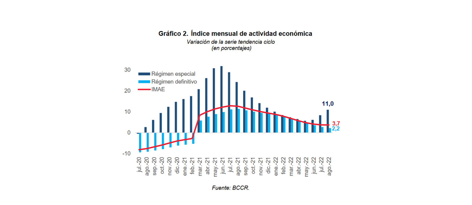 El Banco Central de Costa Rica dio los resultados del Índice Mensual de Actividad Económica (IMAE) correspondiente al mes de agosto del 2022, el cual registró un incremento interanual de 3,7 % en agosto del 2022, igual a la cifra de crecimiento del mes anterior, e inferior en 9,0 puntos porcentuales (p.p.) con relación al mismo mes del 2021, cuando la producción registró el segundo crecimiento más alto de ese año (12,7 %).