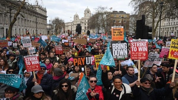 La crisis económica y social que enfrenta Reino Unido, obligó a que más de 500 mil personas de los sectores educación, movilidad y salud se manifestaran este miércoles para exigir una subida salarial que les permita hacer frente a la inflación.