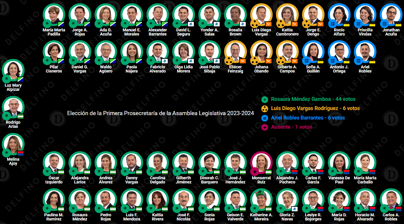 La verdiblanca cartaginesa, Rosaura Méndez Gamboa pasará de ser segunda a ser primera prosecretaria del Directorio, tras ser propuesta por su compañero jefe de fracción, Oscar Izquierdo Sandí y competir frente a Ariel Robles Barrantes del FA, propuesto por Priscilla Vindas Salazar; y Luis Diego Vargas Rodríguez del PLP, propuesto por Gilberto Campos Cruz.