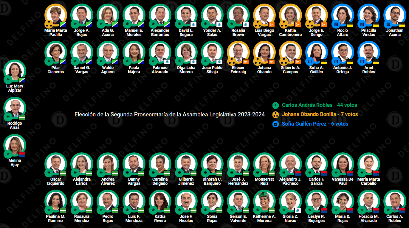 Por su parte Carlos Andrés Robles Obando pasará a ser el segundo prosecretario del Directorio, tras ser propuesto por su compañero de fracción Leslye Bojorges León. El socialcristiano compitió contra Sofía Guillén Pérez del FA; propuesta por Jonathan Acuña Soto; y Johana Obando Bonilla del PLP propuesta por Gilberto Campos Cruz.