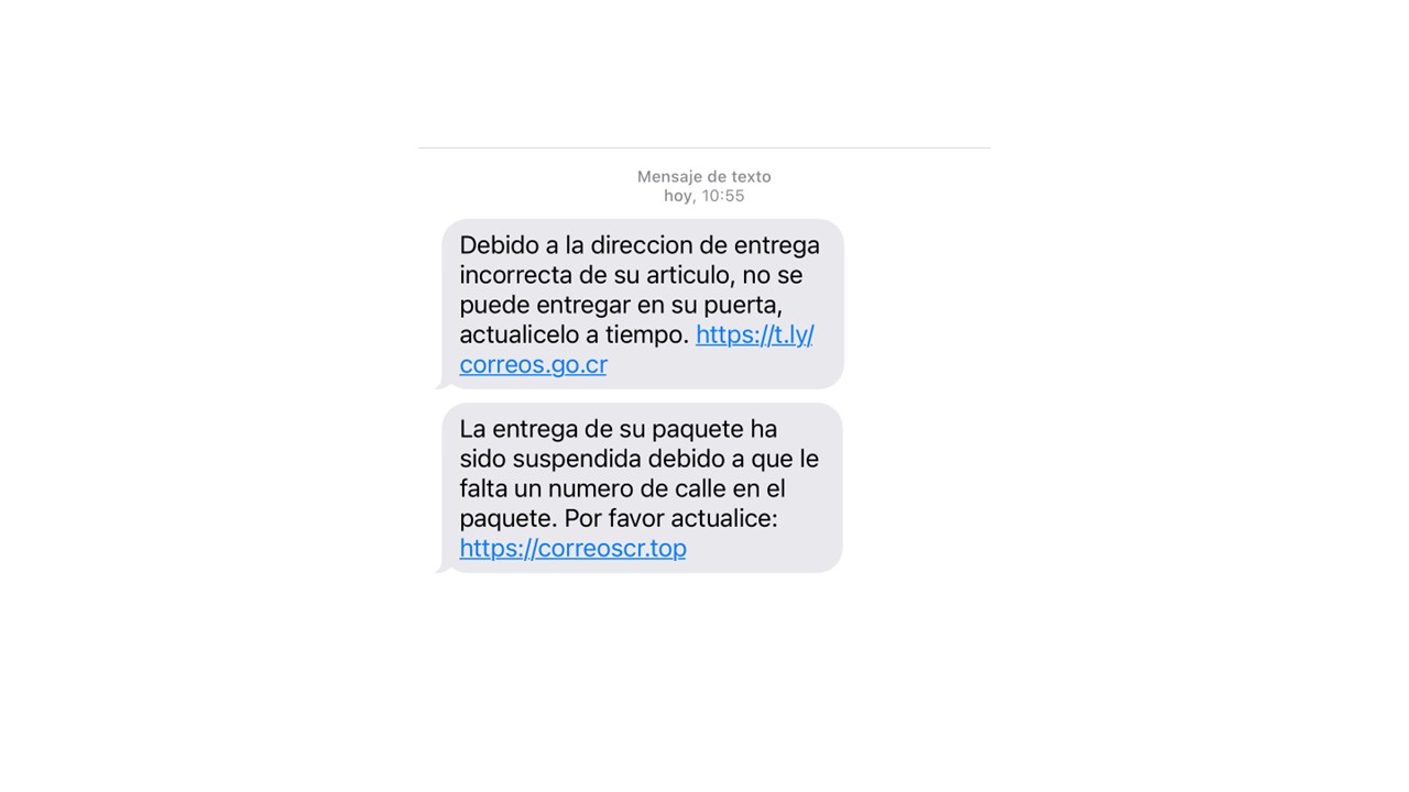 Correos de Costa Rica advirtió que ha recibido un incremento de denuncias sobre mensajes sospechosos recibidos a través de SMS a nombre de la empresa estatal, por lo que solicitan a la población hacer caso omiso de cualquier solicitud de actualización de información o pago adicional por un servicio que le sea solicitado por esta vía, y recuerdan que sus sitios oficiales son: