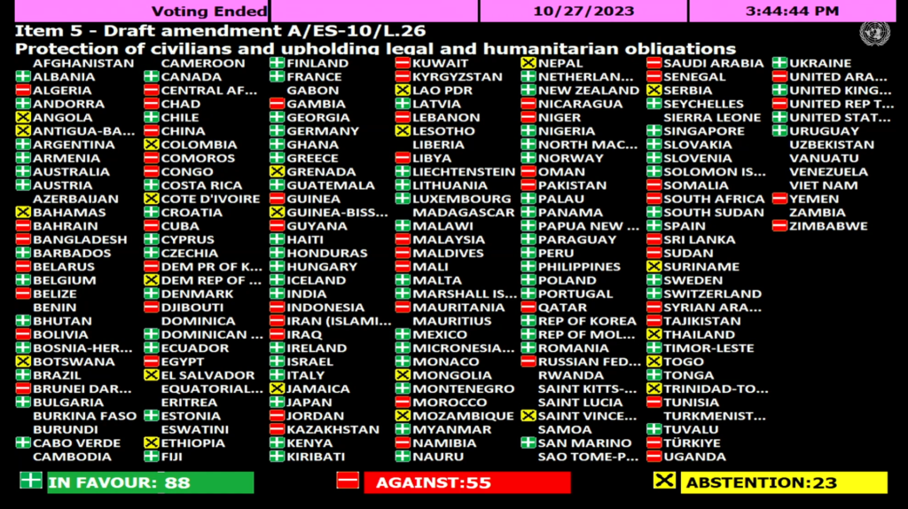La Asamblea General de las Naciones Unidas aprobó este viernes en una sesión de emergencia una resolución denominada "Protección de los civiles y cumplimiento de las obligaciones jurídicas y humanitarias" a raíz de la guerra entre Hamás e Israel y el asedio de este último a la Franja de Gaza, desde donde la organización islámica llevó a cabo un ataque terrorista el pasado 7 de octubre.