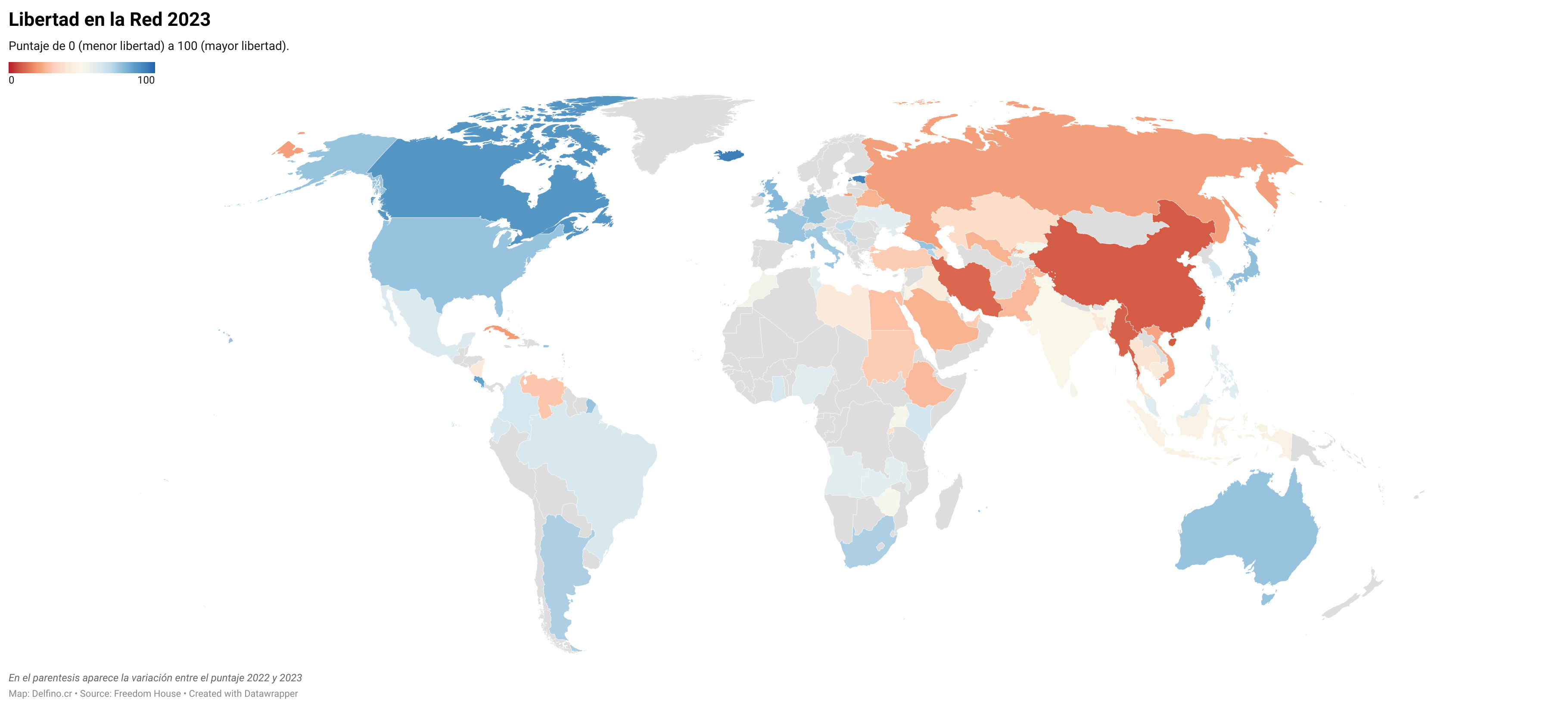 Los resultados forman parte de la 13ª edición del informe Libertad en la Red, un estudio anual sobre derechos humanos en línea. El proyecto evalúa la libertad en internet en 70 países, lo que representa el 88 por ciento de las personas usuarias de internet en el mundo y abarca los acontecimientos ocurridos entre junio de 2022 y mayo de 2023.