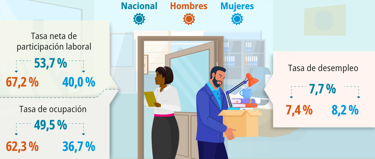 Adicionalmente, la tasa de ocupación (porcentaje de personas ocupadas con respecto a la población de 15 años o más) fue de 49,5%, lo que significa que menos de la mitad de las personas en edad de trabajar tienen un empleo, por otro lado, la tasa neta de participación laboral (personas que forman parte de la fuerza de trabajo) fue de 53,7%, en ambos casos con caídas interanuales estadísticamente significativas de 3,3 y 6 p.p. respectivamente.