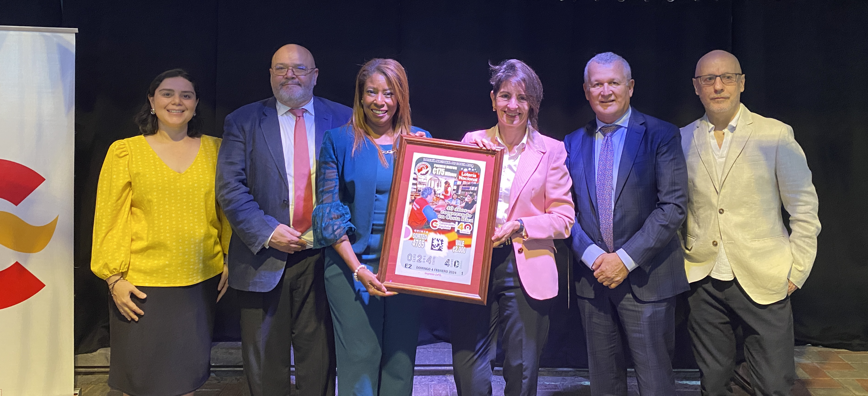 Para iniciar esta celebración, el billete del sorteo de la Lotería Nacional del próximo 4 de febrero está dedicado a la trayectoria de trabajo entre Costa Rica y España. La señora Esmeralda Britton, presidenta de la Junta de Protección Social (JPS), entregó hoy a la embajadora de España, una réplica ampliada del billete en el Centro Cultural de España, en un acto al que asistieron autoridades del Ministerio de Relaciones Exteriores y Culto (MRREEC), el Ministerio de Planificación Nacional y Política Económica (MIDEPLAN) y la Delegación de la Unión Europea (DUE).