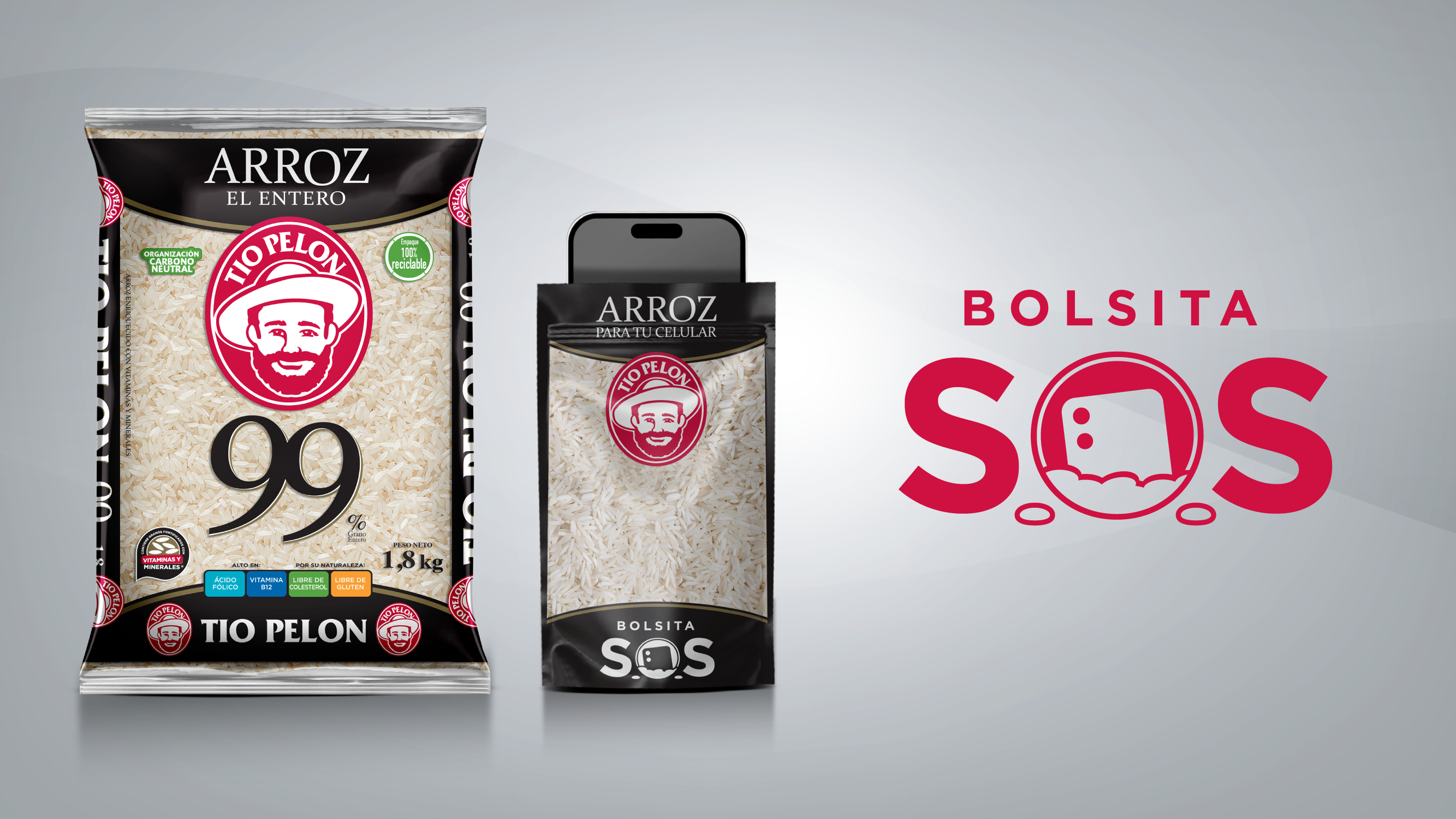 Para la marca conectar con todas las generaciones es importante, y al ser el celular un producto que trasciende generaciones resulta un excelente vehículo para resaltar las bondades del arroz, que no se escapa, de ser protagonista de varios mitos populares, entre éstos el de colocar el celular en arroz si se moja. La Bolsita SOS TIO PELON tiene una gran similitud de diseño a la bolsa de arroz 99% grano entero, uno de sus arroces más populares, además cuenta con un cierre hermético que permite guardar el celular y resguardarlo de agua, tierra, polvo, arena o cualquier otra sustancia que pueda dañarlo. Es también de fácil transporte y, sobre todo, evita el desperdicio, algo que preocupa también a la marca cuando las personas usan la bolsa regular para meter el celular, y por lo general hace que se pierda toda la bolsa de arroz.