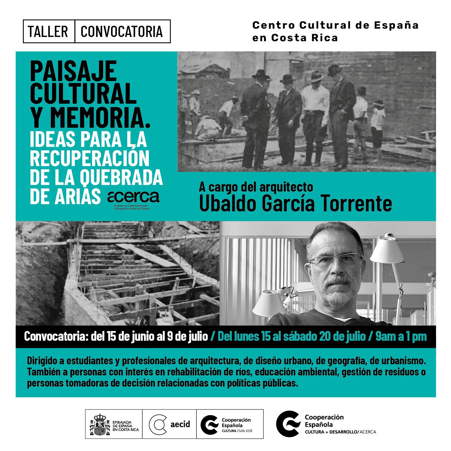 El reconocido arquitecto Ubaldo García Torrente llega desde España para liderar este taller que busca proponer nuevos caminos para rescatar y revalorar la Quebrada de Arias, recorrido vivo que atravesaba la ciudad histórica de norte a sur, irrigando a su paso jardines y plantaciones urbanas; de allí que sea considerado un elemento patrimonial de carácter natural de San José.