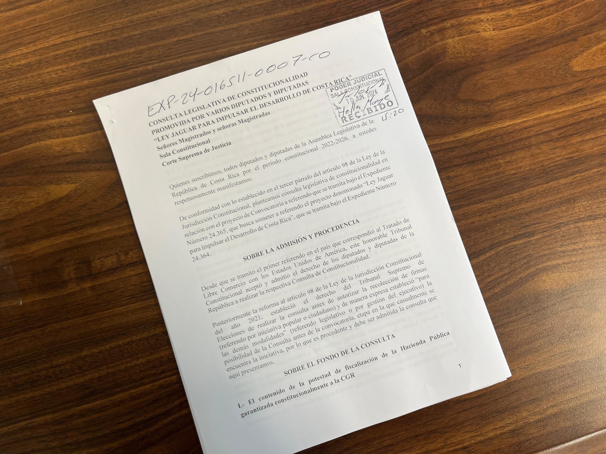 La consulta, que se tramitará bajo el expediente 24-16511-0007-CO, ingresó a las 3:20 p. m. y ahora deberá ser sometida a análisis de admisibilidad en el alto tribunal. Si se define que la consulta es admisible, se notificará la resolución de curso a la Asamblea Legislativa, donde el presidente Rodrigo Arias Sánchez ya circuló a las jefaturas de fracción una resolución en la que se indicaba que, si se presentaba una consulta constitucional previa a la votación, el conocimiento del asunto en el Congreso se suspenderá hasta la resolución del tribunal.