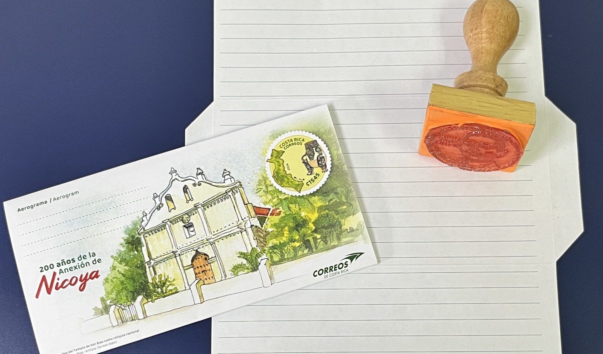 La emisión postal “200 años de la Anexión de Nicoya” está compuesta por un aerograma, una pieza de papel plegable, que exhibe tres ilustraciones de la artista nacional Doreen Bákit: el Templo de San Blas, un sabanero en su quehacer diario y una muestra de la gastronomía Nicoyana.