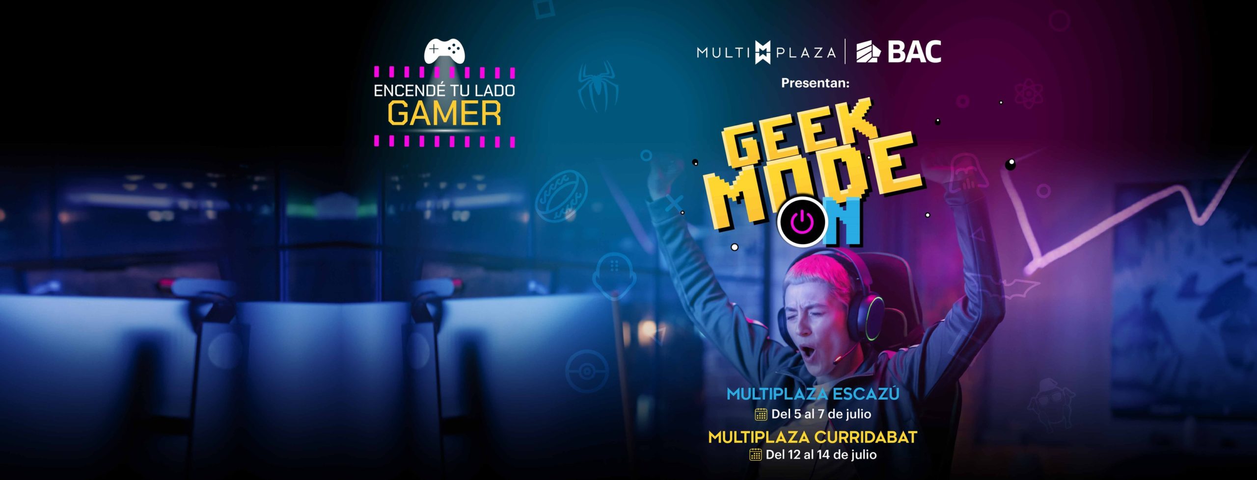 Se trata del Geek Mode On, en el que los gamers vivirán una experiencia inmersiva durante dos fines de semana: del 5 al 7 de julio, en Multiplaza Escazú, y del 12 al 14 de julio, en Multiplaza Curridabat. En Geek Mode Onn encontrarás estaciones con PS5, Nintendo Switch, PCs y arcades, junto con juegos TCG Pokémon. Además, habrá actividades como cosplay, karaoke geek y torneos de Just Dance.