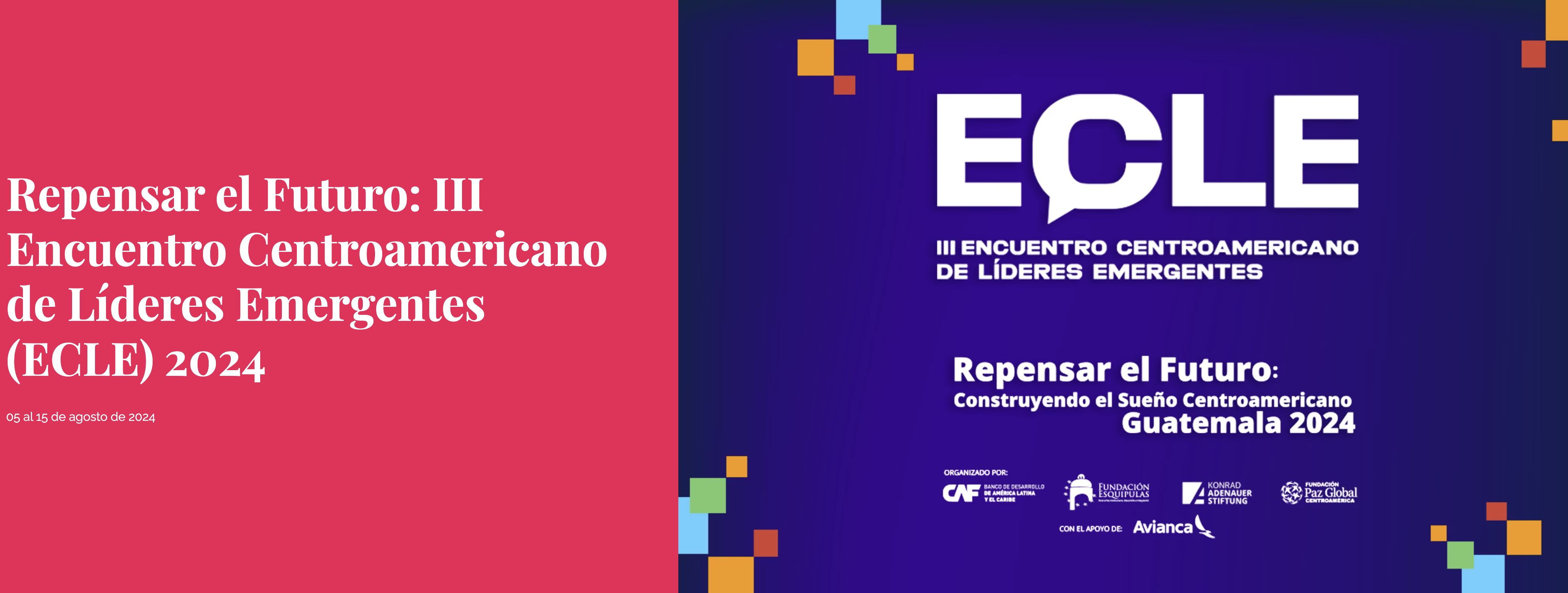 El Encuentro Centramericano de Líderes Emergentes, mejor conocido como ECLE, es un evento organizado por la Fundación Esquipulas junto al Banco de Desarrollo de América Latina y el Caribe (CAF) y la Fundación Konrad Adenauer Stifung. En su versión 2024 líderes y lideresas de toda Centroamérica se congregarán bajo el lema “Repensando el futuro”.