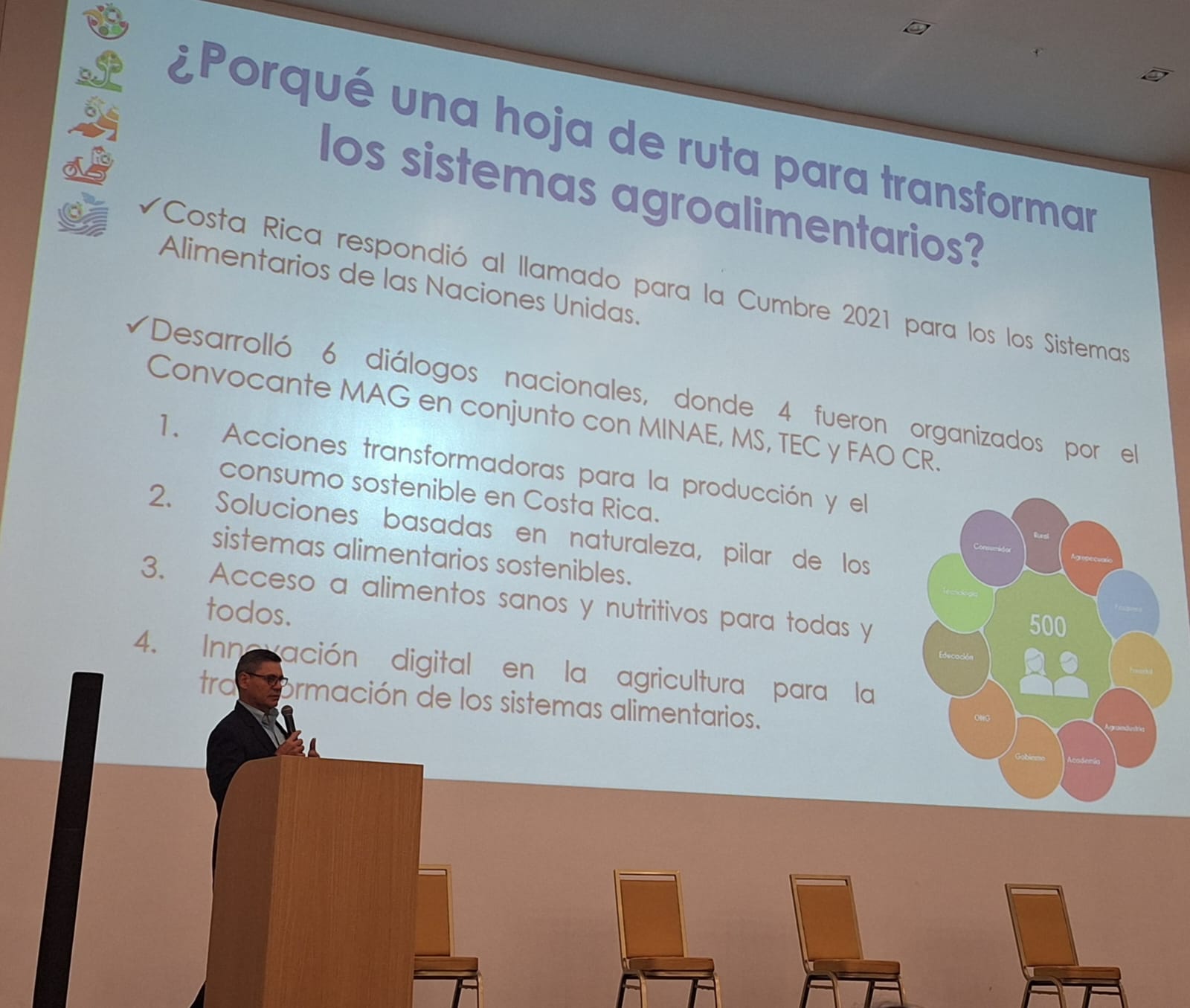 El Ministerio de Agricultura y Ganadería (MAG), junto con el Ministerio de Ambiente y Energía (MINAE), el Ministerio de Salud (MS), el Ministerio de Relaciones Exteriores y Culto (MREC), el Instituto Tecnológico de Costa Rica (TEC) y la FAO en Costa Rica, desarrollaron cuatro diálogos nacionales con la participación de más de 500 personas.