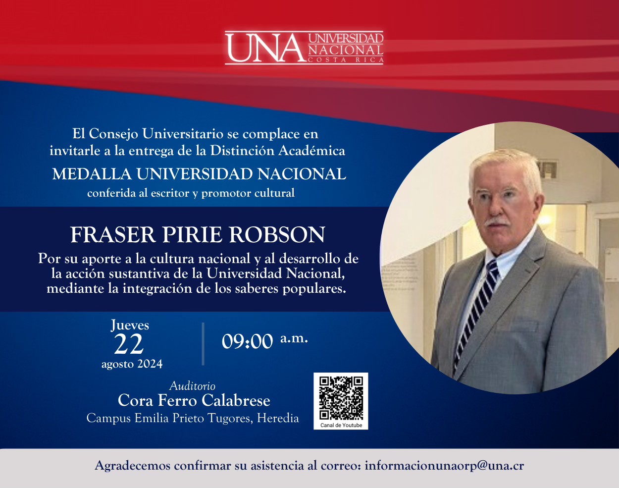 El próximo jueves 22 de agosto a las 9 a.m. en el auditorio Cora Ferro Calabrese, el escritor Fraser Pirie Robson será galardonado con la Medalla Universidad Nacional (UNA) por su larga trayectoria en la producción de temas y pensamiento que se ubican en el conocimiento transformador, el compromiso social, la participación democrática, el diálogo de saberes, la interdisciplinariedad, la regionalización la formación integral y el pensamiento crítico.
