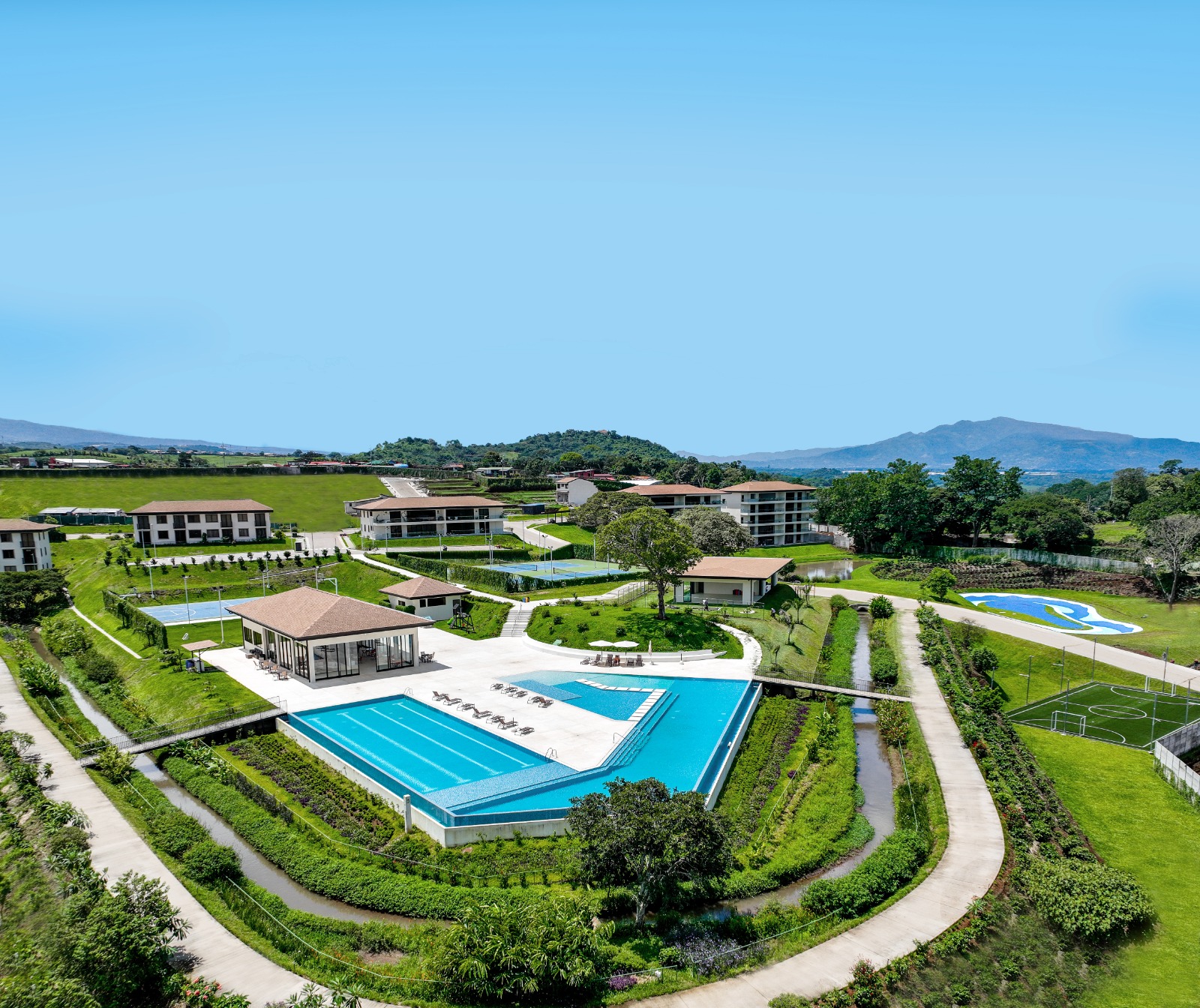 El Canal también destaca por sus amplias amenidades, con senderos, jardines interconectados y el complejo de entretenimiento más grande del país. Esto incluye dos casas club, una piscina con diseño adaptado al paisaje, canchas deportivas para diversos deportes, y áreas de coworking. Además, cuenta con una pista de Surfskate única en América, múltiples parques para perros, salón de yoga y un gimnasio equipado