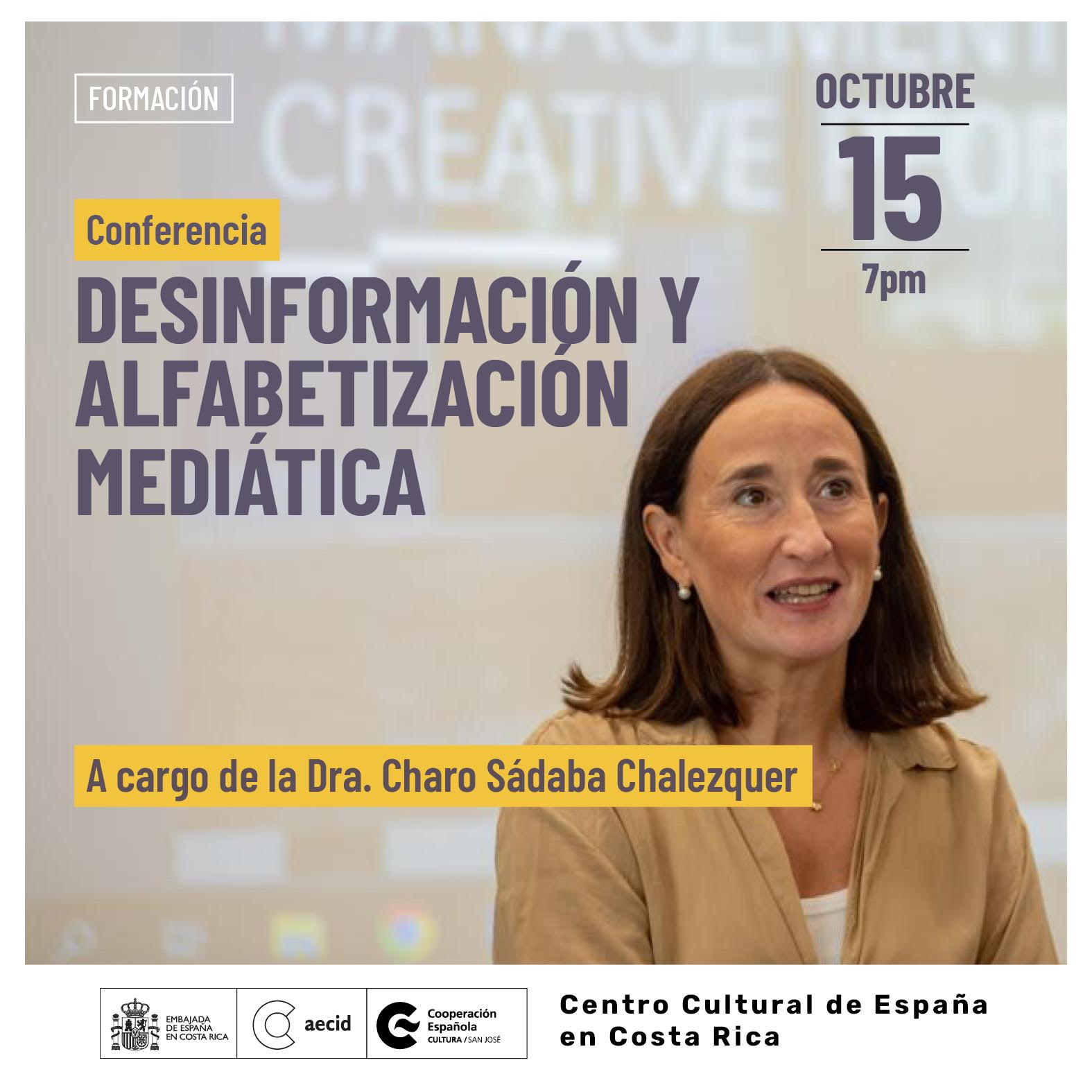 El próximo martes 15 de octubre a las 7:00 p.m., el Centro Cultural de España en Barrio Escalante será el escenario de la conferencia Desinformación y alfabetización mediática, impartida por la Dra. Charo Sádaba Chalezquer, Catedrática y Decana de la Facultad de Comunicación de la Universidad de Navarra.