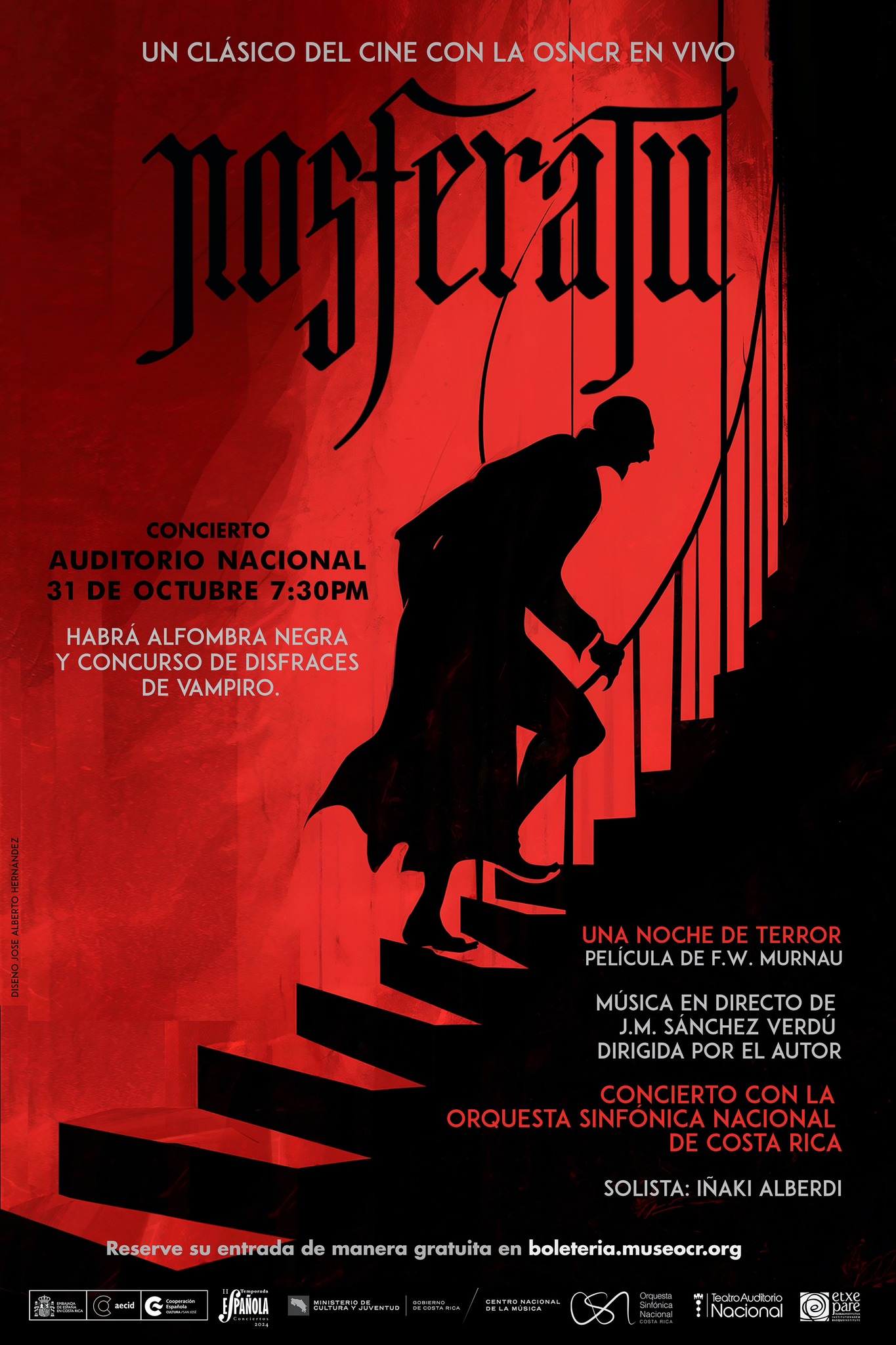 El próximo jueves 31 de octubre, el Teatro Auditorio Nacional será el escenario de una auténtica noche de terror, con la proyección de la icónica película Nosferatu (1922) del director F.W. Murnau, acompañada por la Orquesta Sinfónica Nacional de Costa Rica, bajo la dirección del compositor español José María Sánchez-Verdú.