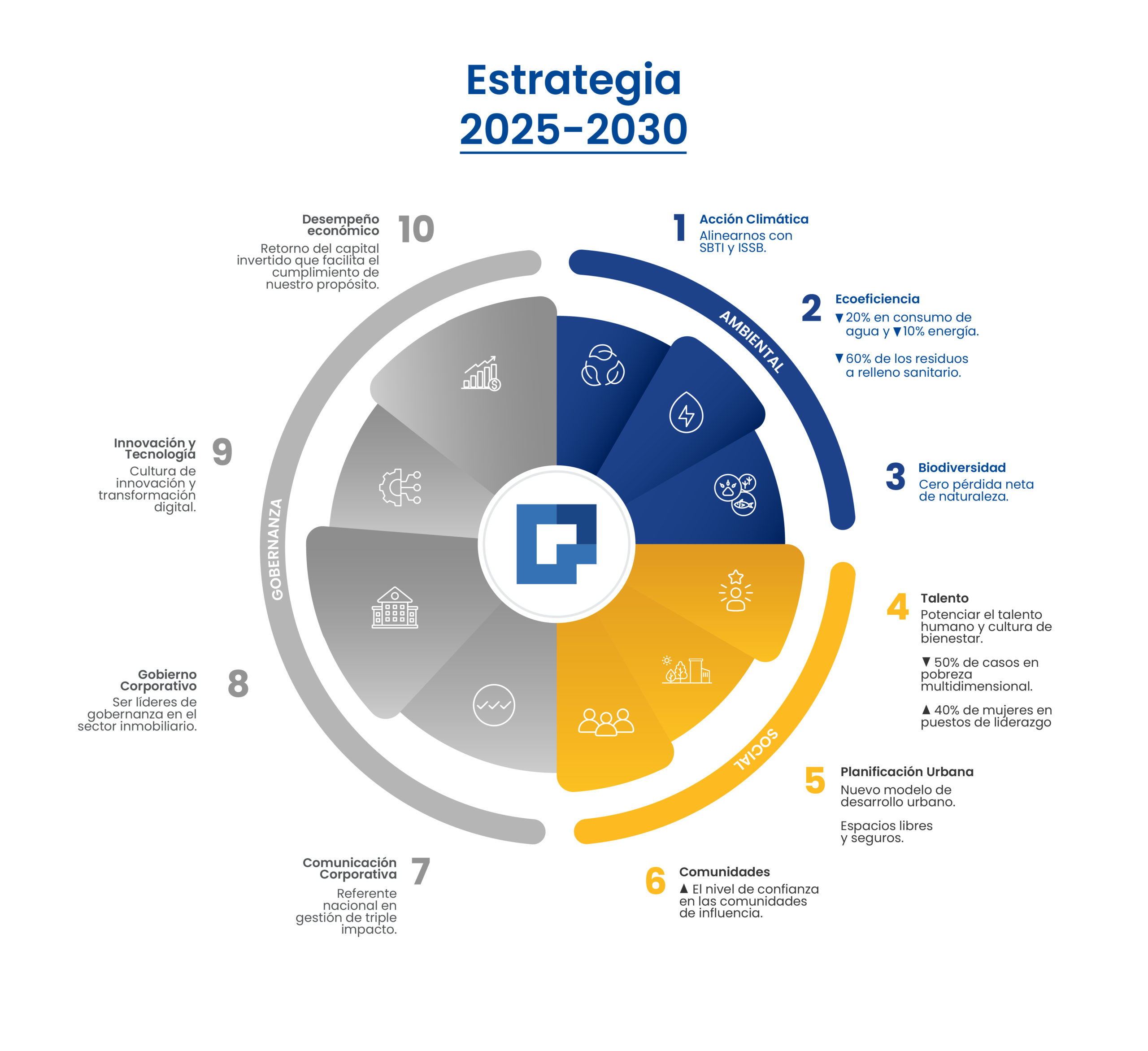 - Acción Climática: Alinear nuestras operaciones con las metas establecidas por Science Based Targets initiative (SBTi) y los estándares del International Sustainability Standards Board (ISSB) para mitigar el impacto del cambio climático.