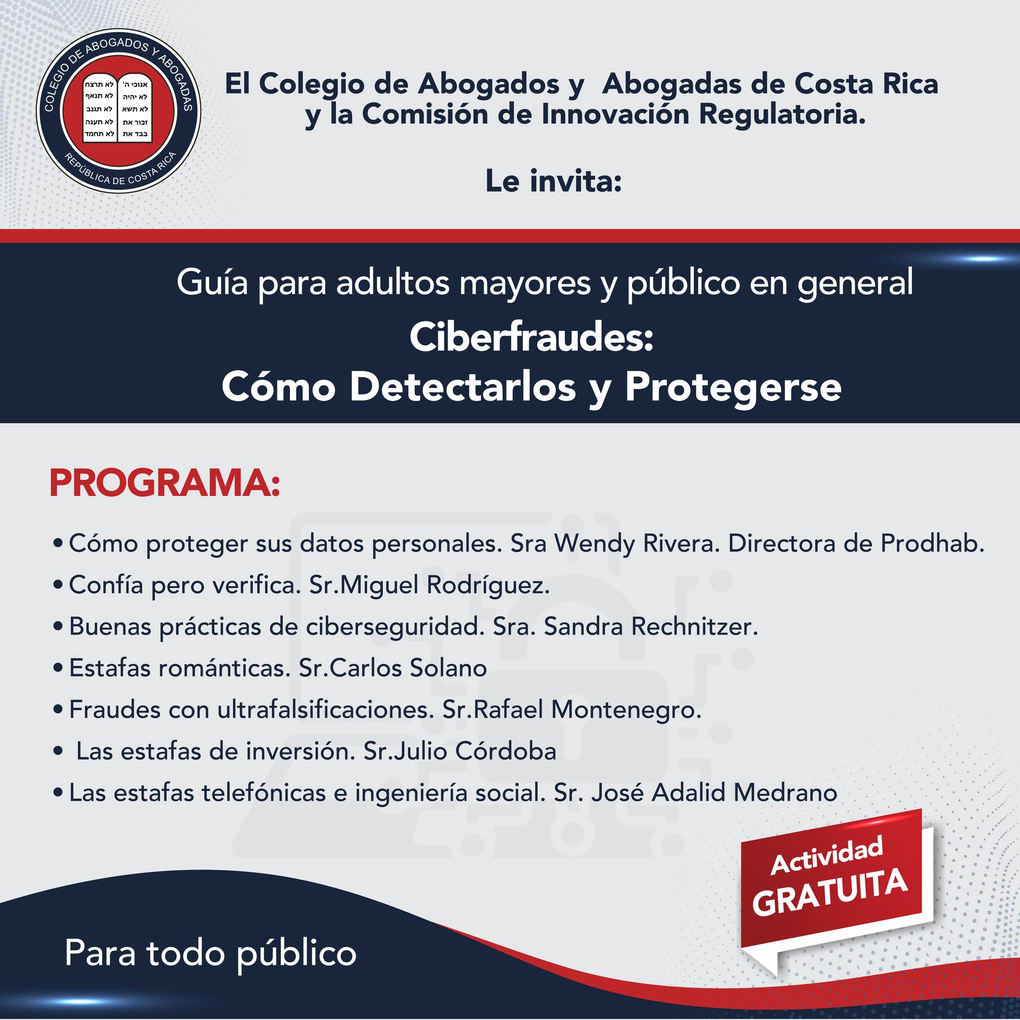 Por esa razón, el Colegio de Abogados y Abogadas de Costa Rica, junto con su Comisión de Innovación Regulatoria, invita a su próxima charla: “Ciberfraudes: ¿Cómo Detectarlos y Protegerse?”, la cual se llevará a cabo el 13 de diciembre de 2024 en el auditorio Pablo Casafont, en Zapote (invitación adjunta).