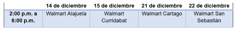 En Walmart Alajuela, Curridabat, Cartago y San Sebastián, los clientes podrán tomarse fotografías con Santa Claus y llevárselas impresa (ver calendario), al presentar su tiquete de compra que incluya mínimo dos de los productos patrocinadores que podrán verificar en las tiendas.