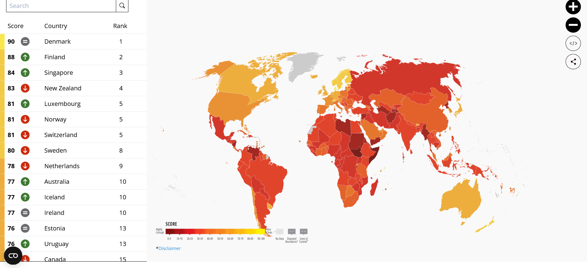 Según destaca el informe, Dinamarca encabeza la clasificación, por séptimo año consecutivo, con una puntuación de 90. Finlandia y Singapur ocupan el segundo y tercer lugar, con puntuaciones de 88 y 84, respectivamente. Con una puntuación de 83, Nueva Zelanda quedó por fuera de los tres primeros puestos por primera vez desde 2012, pero se mantiene dentro del top 5, y le siguen: Luxemburgo (81), Noruega (81), Suiza (81), Suecia (80), Países Bajos (78), Australia (77), Islandia (77) e Irlanda (77).