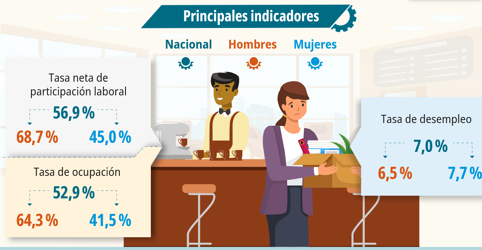 Las mujeres tienen una tasa neta de participación laboral de 45%, mostrando un aumento de 3,3 puntos porcentuales de manera interanual. Para el caso de los hombres, este indicador fue de 68,7% (…). En lo referido a las mujeres, la tasa de ocupación se situó en 41,5%, aumentando en 3,6 puntos porcentuales de manera interanual. Para los hombres, este indicador fue de 64,3%”.